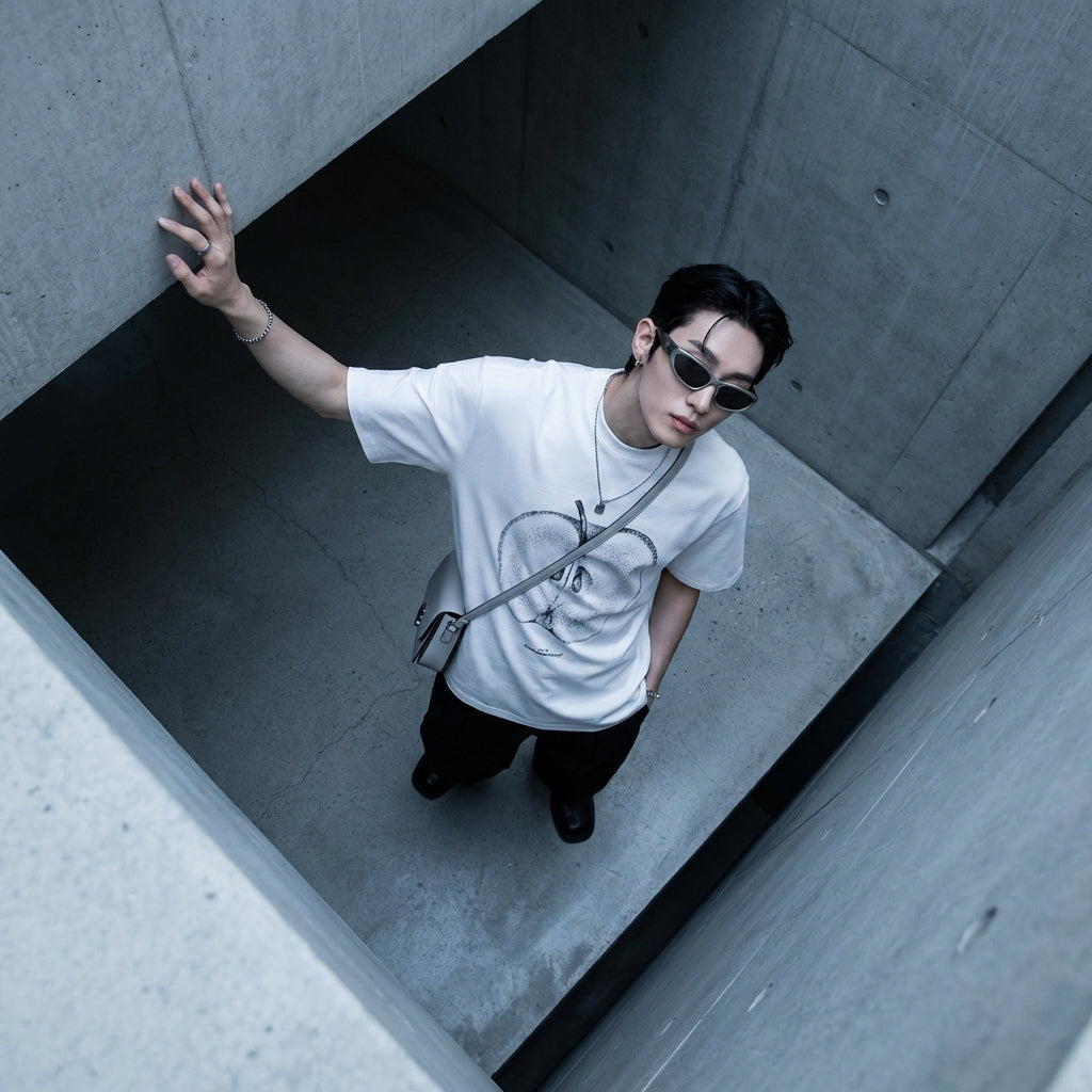 - Estilo: K-fashion, Streetwear, Minimalista. Esta camiseta encarna la estética relajada y limpia de la moda coreana, perfecta para un look urbano y moderno.