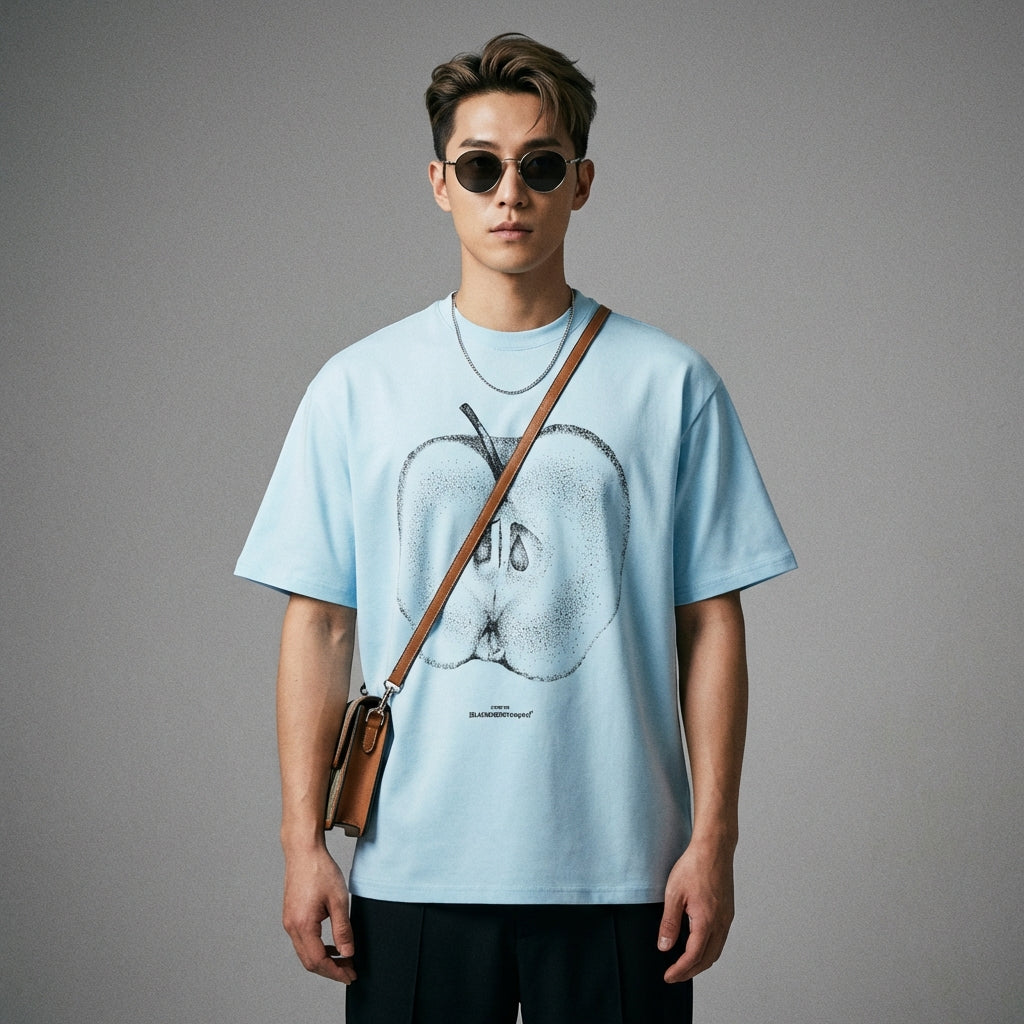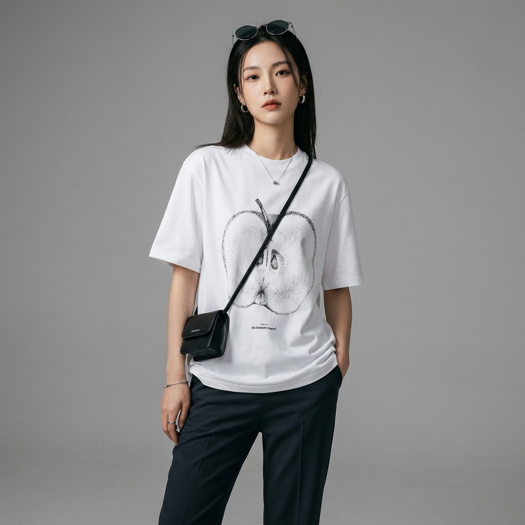Adopta un look casual y moderno con nuestra camiseta de cuello redondo y manga corta, adornada con un discreto estampado de manzana. ¡Su corte holgado y diseño limpio la convierten en un imprescindible para un estilo minimalista y cómodo! 🍎
