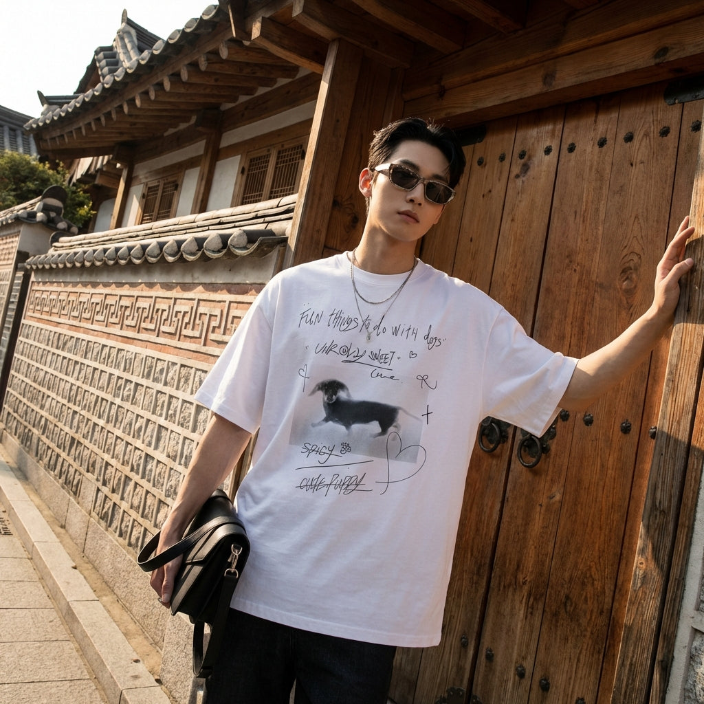 - Estilo: Streetwear, Casual, K-fashion. Esta camiseta encarna el espíritu de la moda coreana, con un corte amplio y un estampado moderno, perfecto para un look urbano y con estilo.