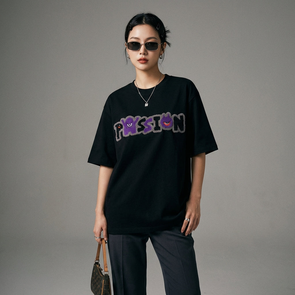 Adopta un look casual y a la moda con nuestra camiseta oversize, adornada con una letra de terciopelo en la parte delantera. ¡Este modelo de cuello redondo y mangas cortas es perfecto para un estilo urbano y moderno, ideal para cualquier ocasión! ✨