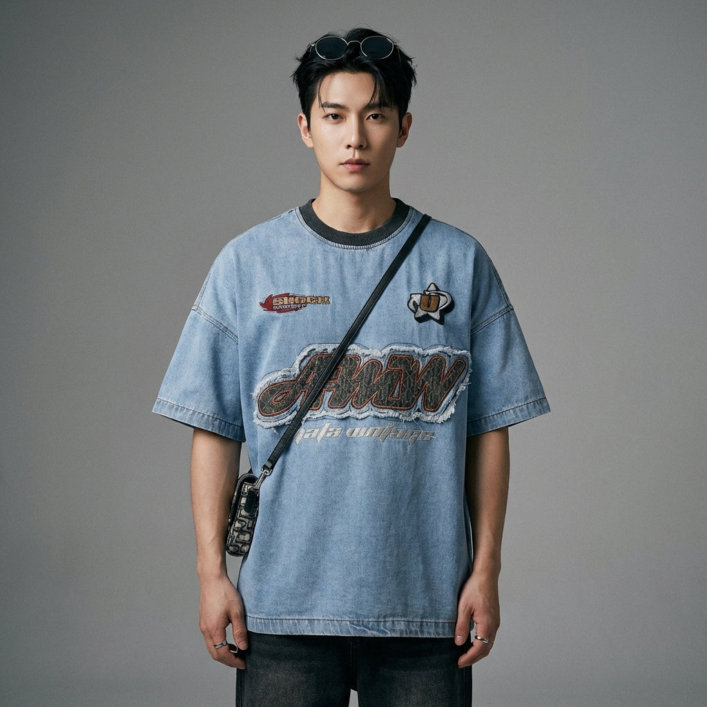 Adopta un look casual y a la moda con nuestra camiseta de denim lavado, perfecta para el verano. ¡Su corte holgado y sus detalles de letras bordadas la convierten en un imprescindible del estilo urbano! 👕