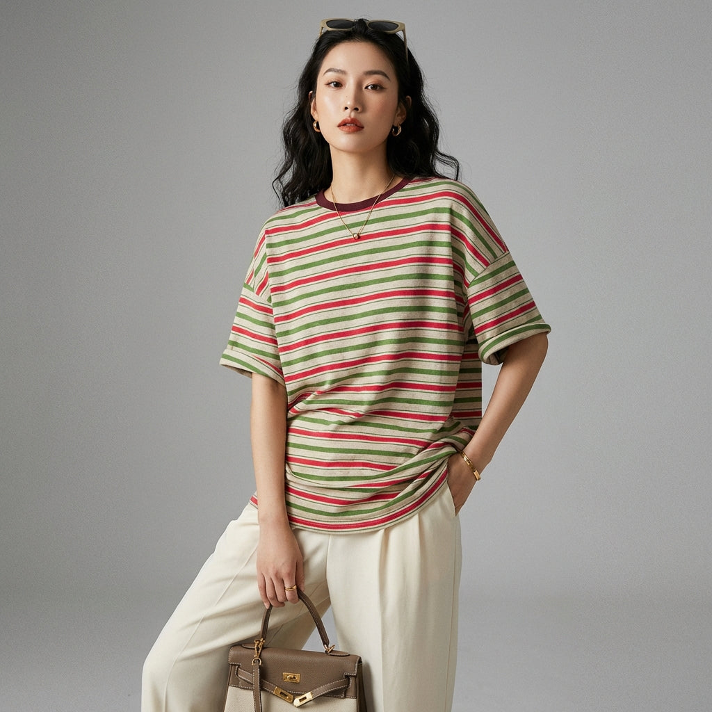 Adopta un look casual y a la moda con nuestra camiseta de manga corta y cuello redondo, adornada con elegantes rayas. Diseñada para la comodidad y el estilo, ¡esta versátil prenda es un esencial del guardarropa moderno! 👕