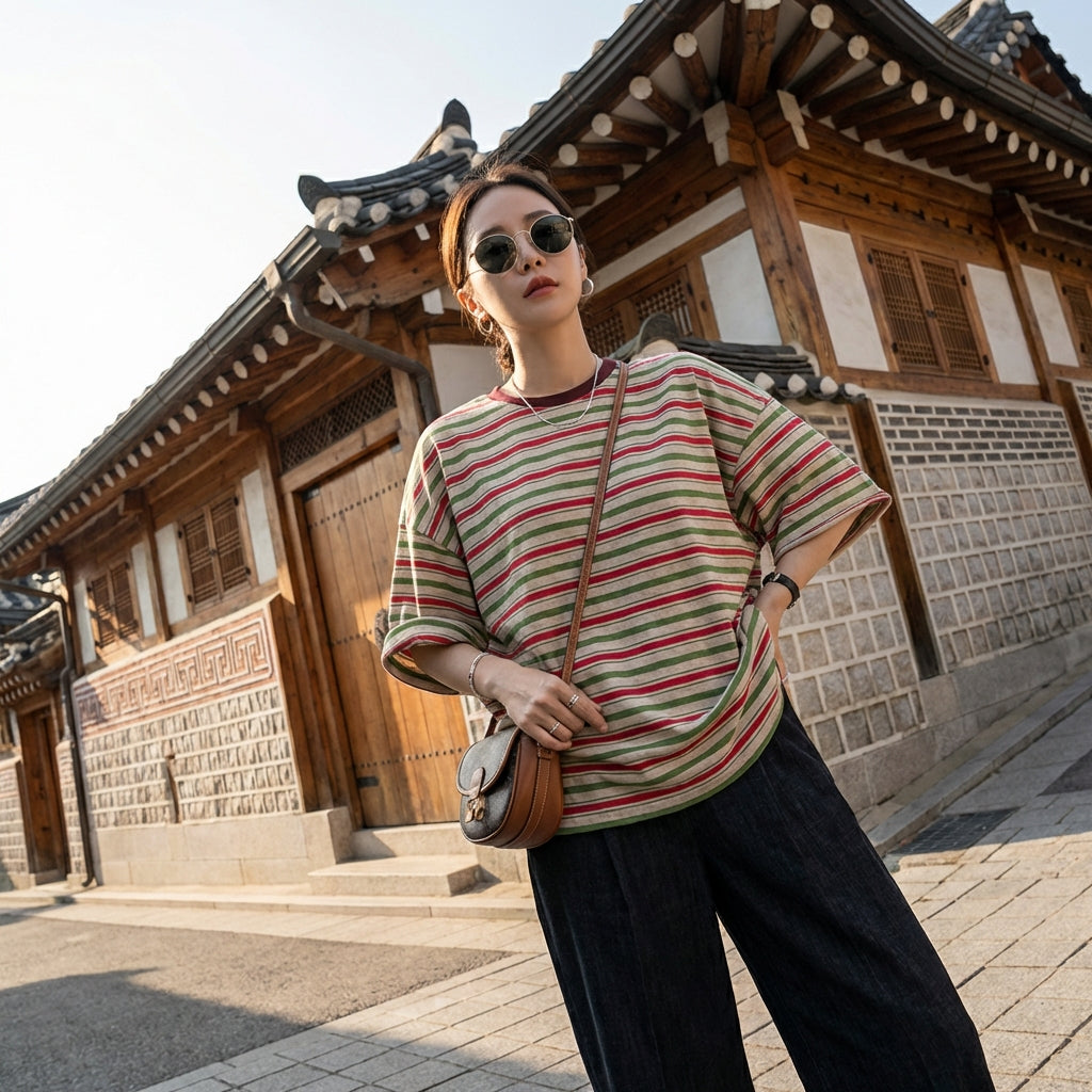 - Estilo: Streetwear, Minimalista, K-fashion. Esta camiseta encarna la elegancia casual de la moda coreana, perfecta para un look urbano y moderno.