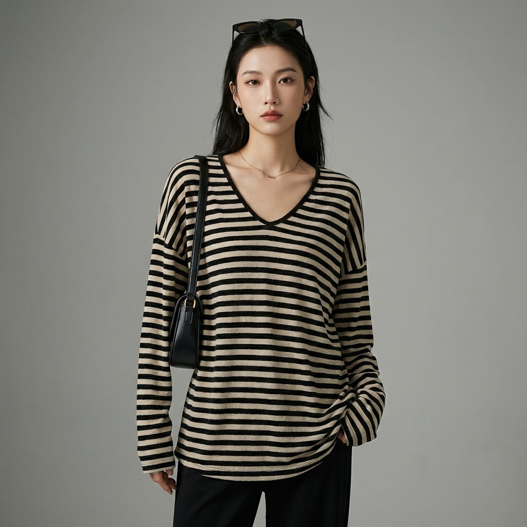 Adopta un look casual y chic con nuestra camiseta de rayas de manga larga y cuello en V. Ideal para los días soleados, ofrece una protección ligera sin dejar de ser elegante y cómoda. ¡Perfecta para un estilo diario o una escapada veraniega! ☀️