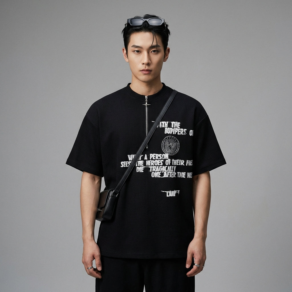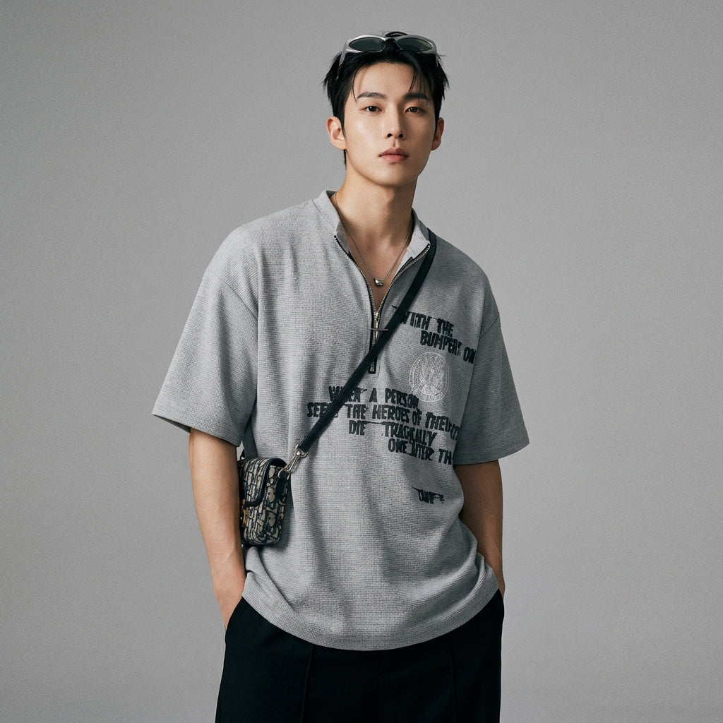 Afirma tu estilo urbano con nuestra camiseta de manga corta y cuello redondo, con media cremallera y corte holgado. ¡Esta prenda de moda es perfecta para un look casual y moderno, ideal para todas tus salidas veraniegas! 👕
