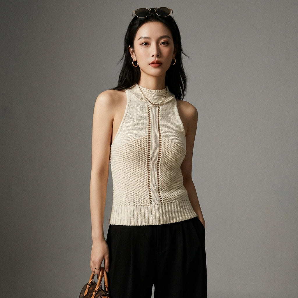 Adopta un look chic y moderno con nuestro chaleco de punto ajustado. ¡Su elegante diseño con cuello halter realzará tu figura para un estilo impecable en cualquier ocasión! ✨