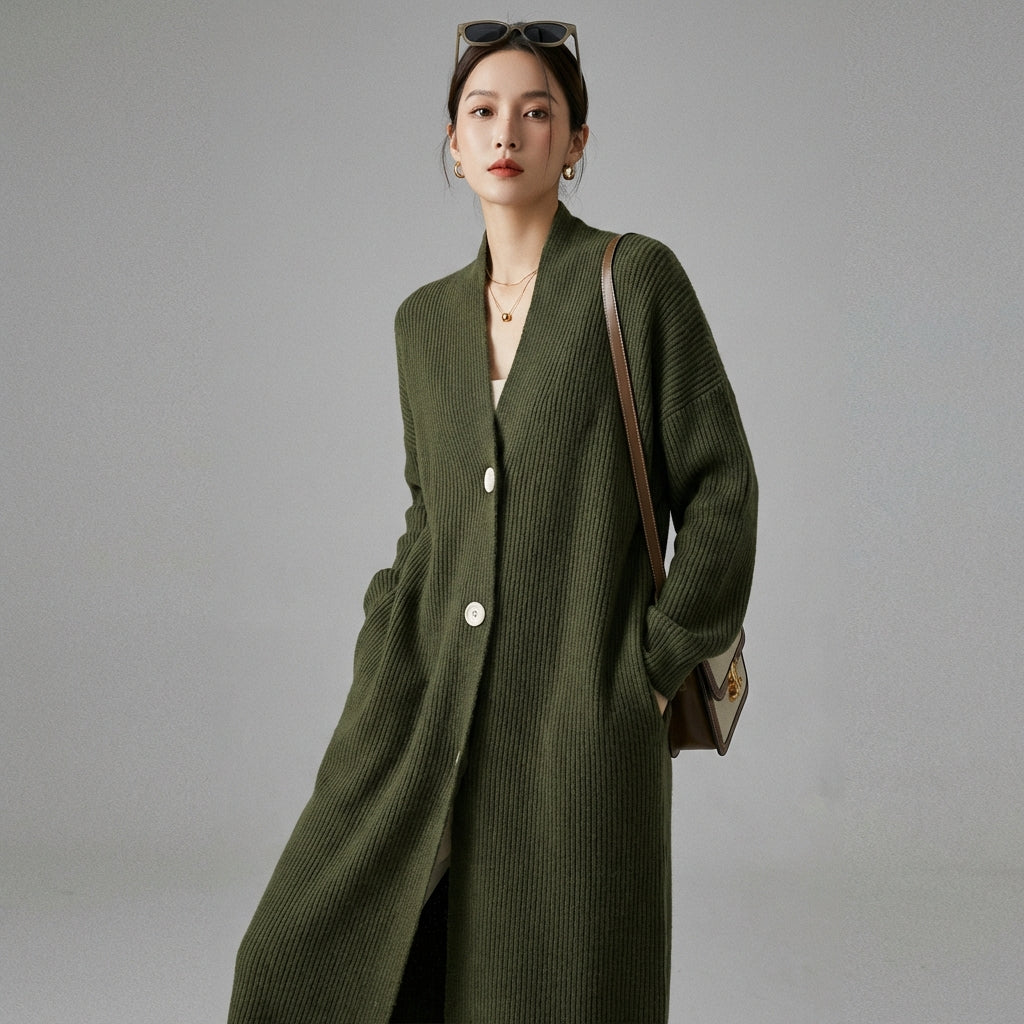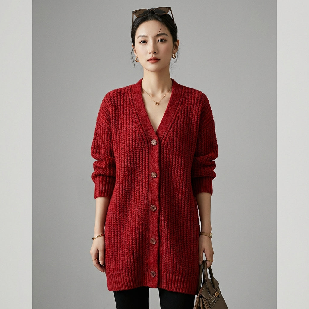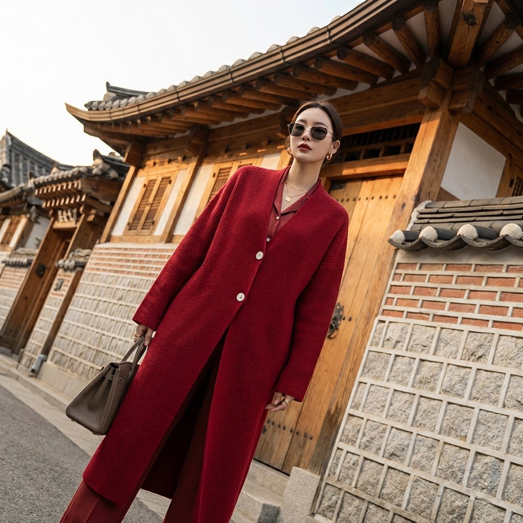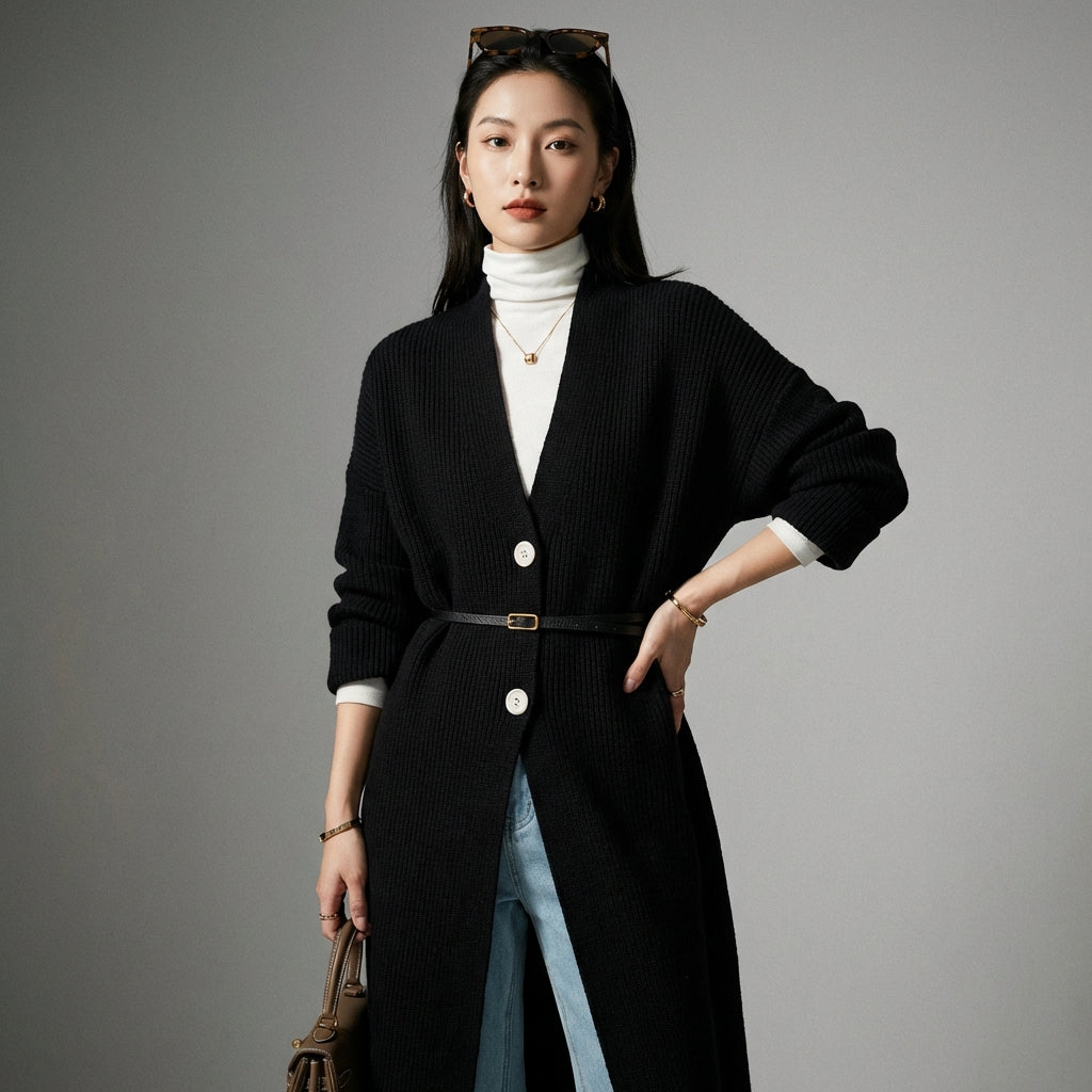 - Estilo: Elegante, Minimalista, K-fashion. Este cárdigan encarna la elegancia discreta y las líneas limpias de la moda coreana, perfecto para un look chic y moderno.