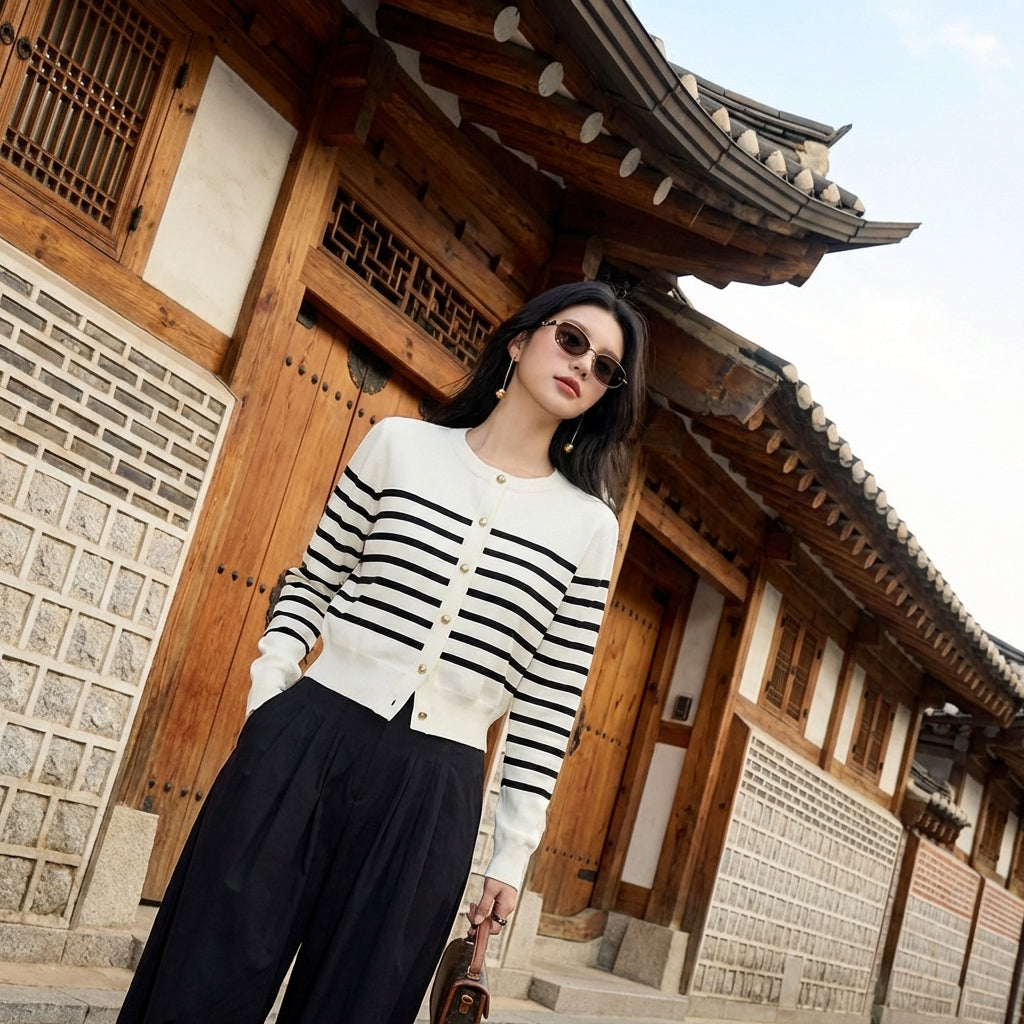 Este cárdigan a rayas es la pieza ideal para complementar tus atuendos con un toque de sofisticación y comodidad, reflejando la esencia de la moda coreana.