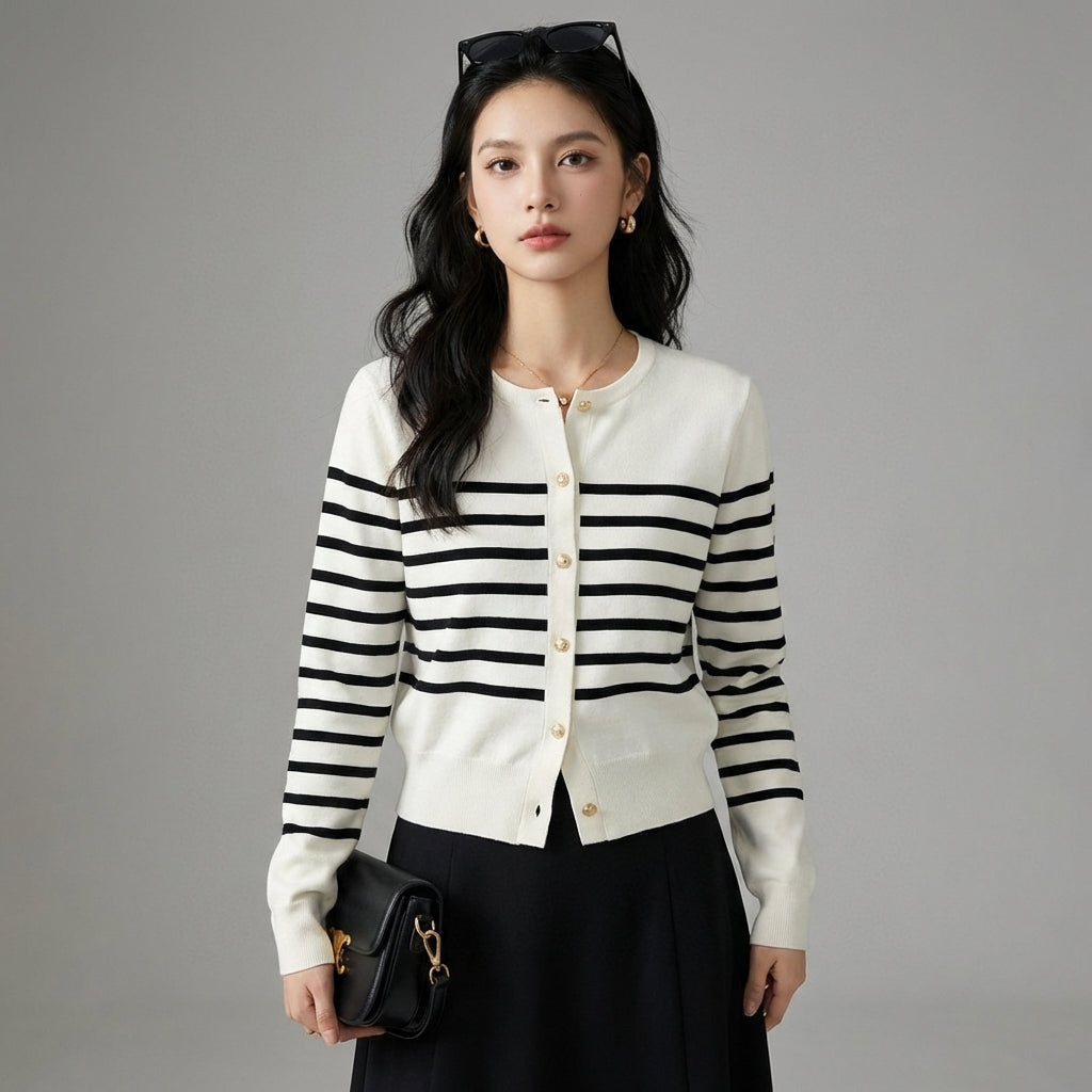 Adopta un look casual y elegante con nuestro cárdigan a rayas, perfecto para cualquier ocasión. Su diseño versátil y su corte cómodo lo convierten en un imprescindible de tu armario para un toque de moda coreana refinada. ✨
