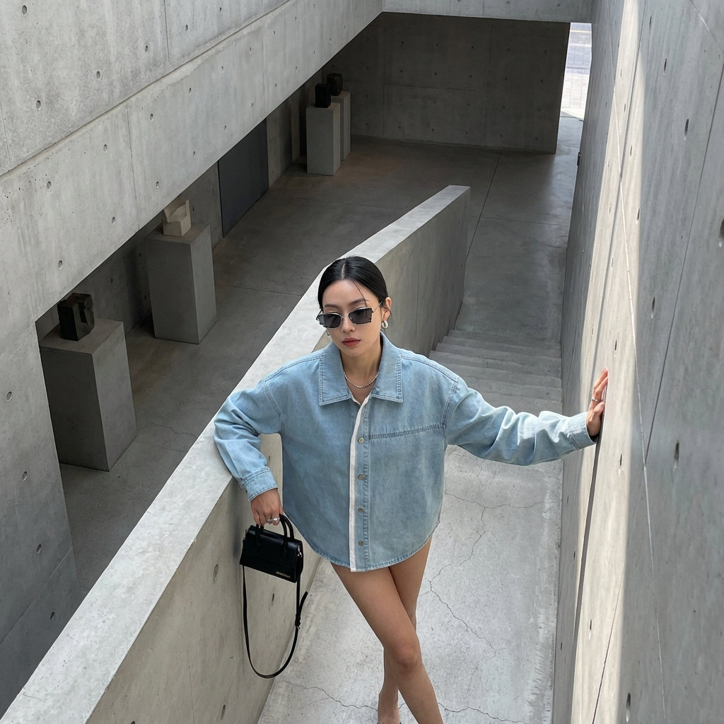 Esta chaqueta camisera de denim es un imprescindible para quienes buscan una prenda fácil de llevar, que combine comodidad y estilo urbano inspirado en la moda coreana.