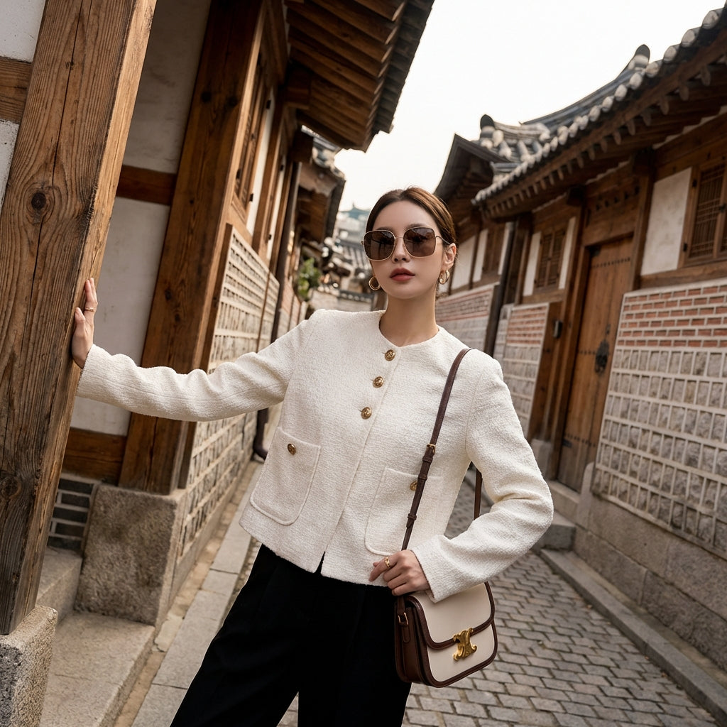 - Estilo: Elegante, Minimalista, K-fashion. Esta chaqueta encarna la elegancia discreta y las líneas limpias de la moda coreana, perfecta para un estilo asertivo.