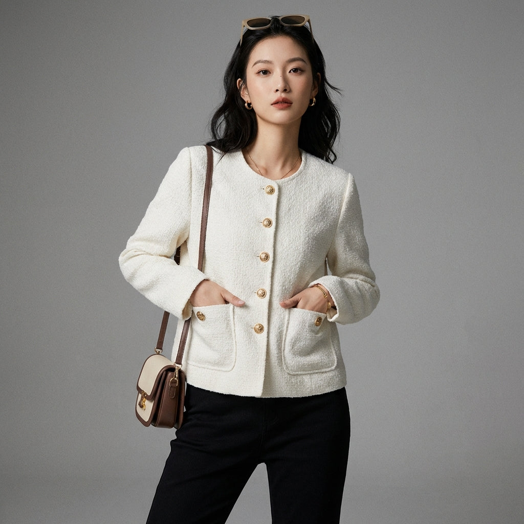 - Tipo: Chaqueta corta, Cuello redondo, Mangas largas. Un corte clásico y atemporal, fácil de combinar con faldas, pantalones o vestidos.