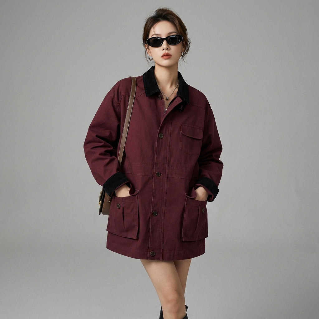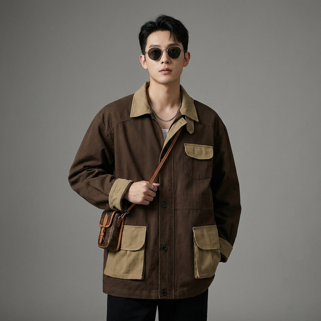 Adopta un look casual y con estilo con nuestra chaqueta de trabajo de longitud media para hombre. Con múltiples bolsillos y cuello vuelto, esta chaqueta ofrece un ajuste holgado y cómodo, perfecto para todas tus actividades diarias. ¡Su diseño color block aporta un toque moderno y atrevido a tu armario! 🍂