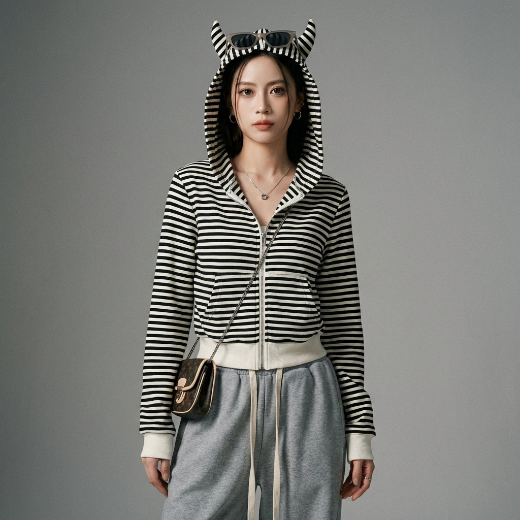 Afirma tu estilo con nuestra chaqueta sudadera con capucha y cremallera, con rayas atrevidas y un diseño original. Perfecta para un look casual y a la moda, ¡combina comodidad y modernidad para tus días activos! ✨