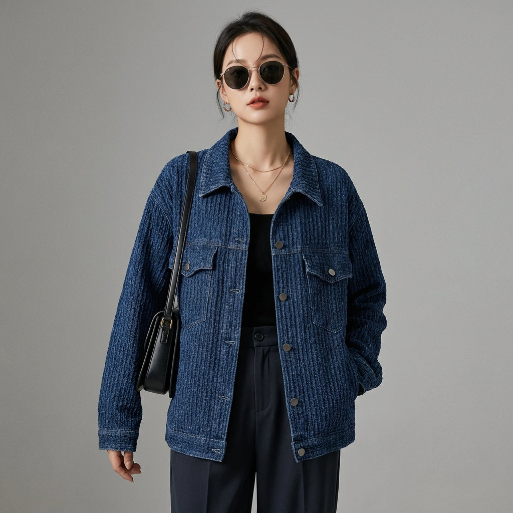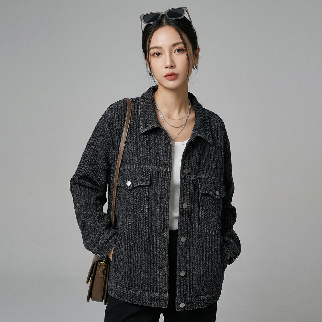 - Estilo: Streetwear, Casual, K-fashion. Esta chaqueta encarna el espíritu de la moda coreana con un corte holgado y un diseño atemporal, ideal para un look urbano.