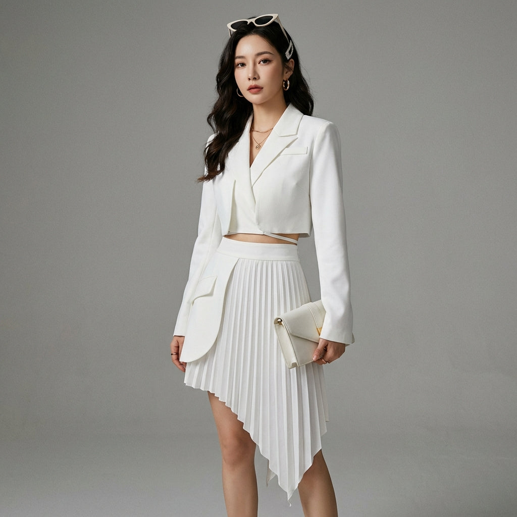 Adopta un look chic y casual con nuestro conjunto de blazer corto de manga larga y falda plisada de talle alto. ¡Perfecto para una silueta moderna y elegante, este conjunto es ideal para todas las ocasiones, desde la oficina hasta las salidas con amigas! 💫