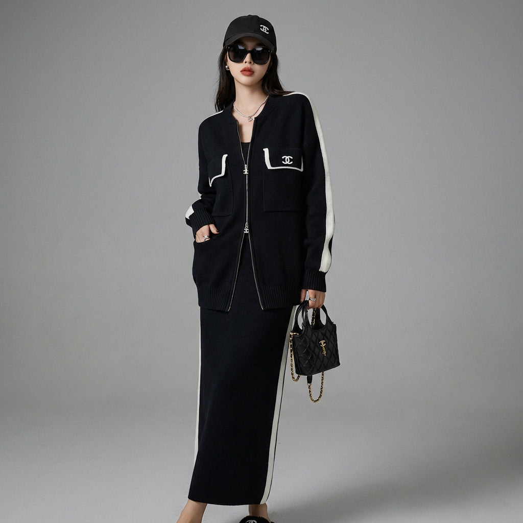 - Tipo: Conjunto, Cárdigan, Falda. Un conjunto versátil, fácil de llevar junto o por separado para diversas ocasiones.