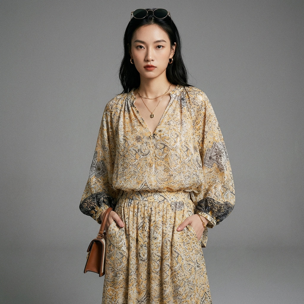 - Tipo: Conjunto casual, Camisa larga, Falda midi. Un corte pensado para la fluidez y el movimiento, adaptándose a diversas ocasiones.