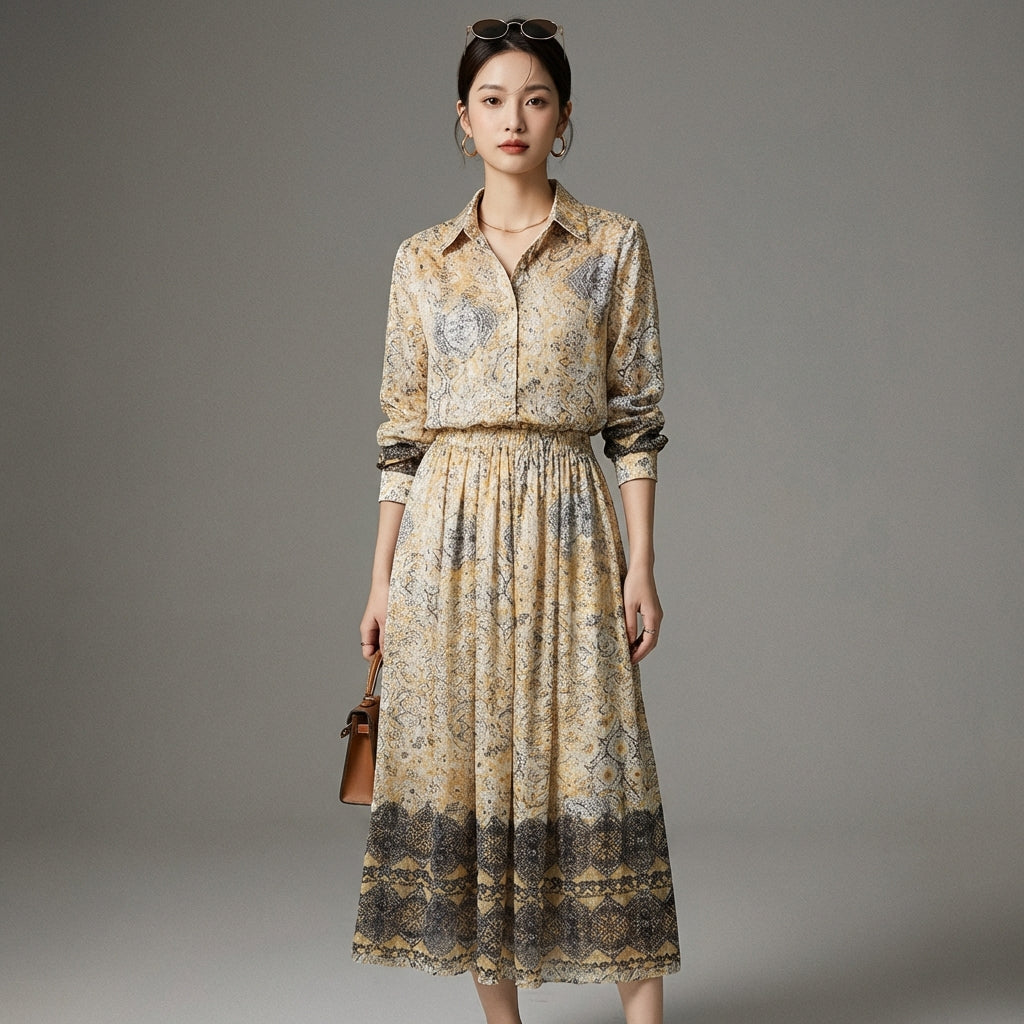 Descubre nuestro conjunto chic y moderno, compuesto por una camisa de manga larga y una falda midi, ambos adornados con estampados. Diseñado para quienes aman combinar comodidad y estilo, ¡este conjunto es perfecto para afirmar tu personalidad con elegancia! ✨