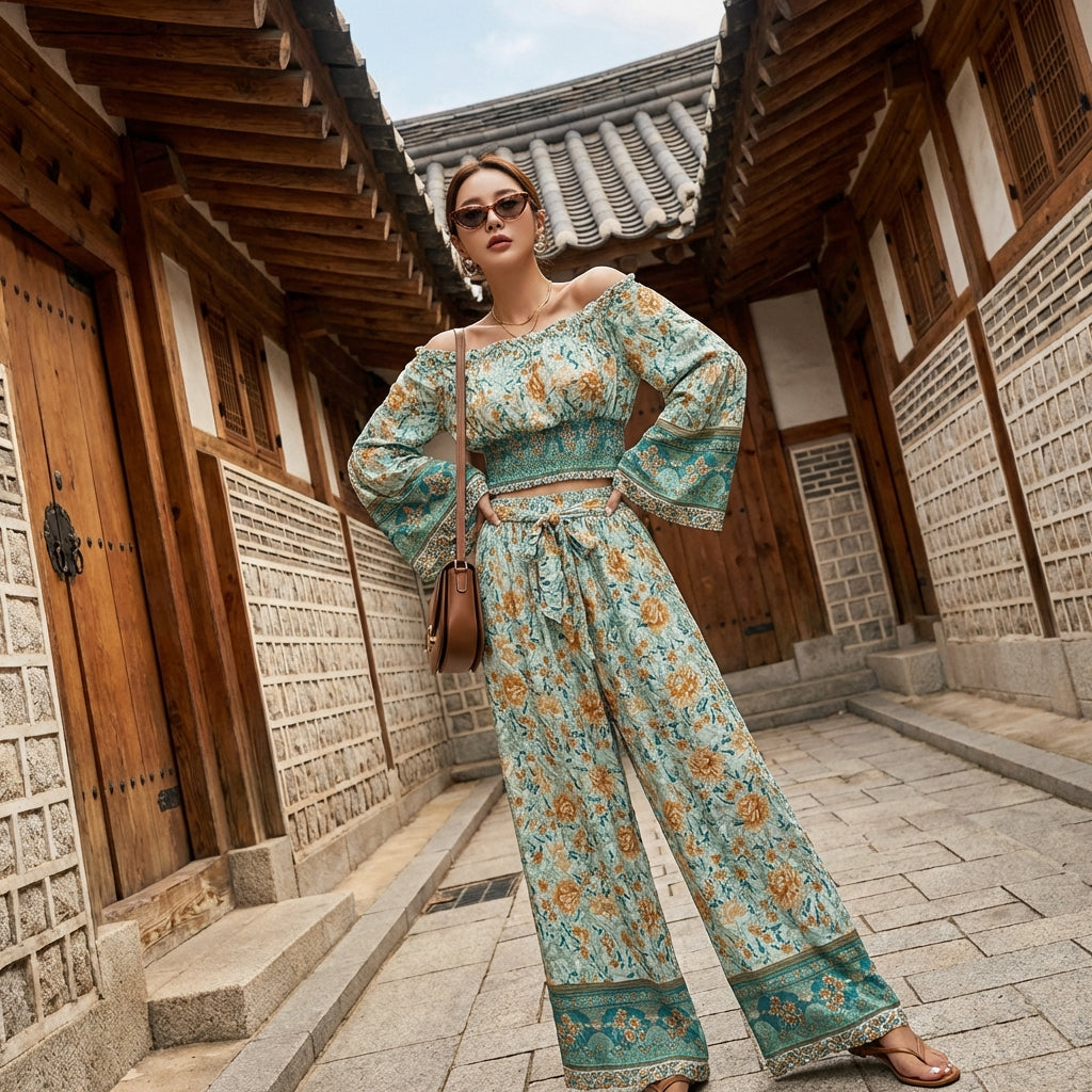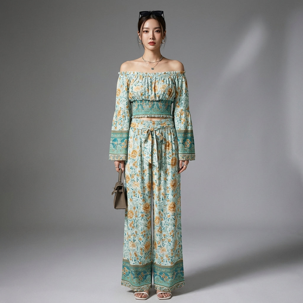 Adopta un look casual y chic con este conjunto de dos piezas, perfecto para la mujer moderna. Se compone de un top de manga larga de algodón con estampado vintage y un pantalón de cintura alta de pierna ancha de rayón, ¡ofreciendo comodidad y elegancia para todas tus ocasiones! 🌸