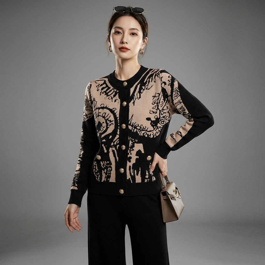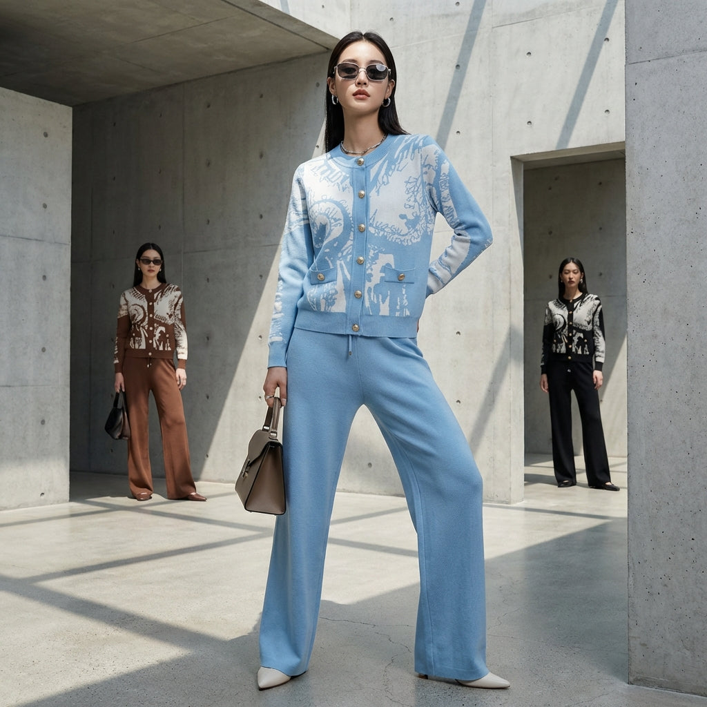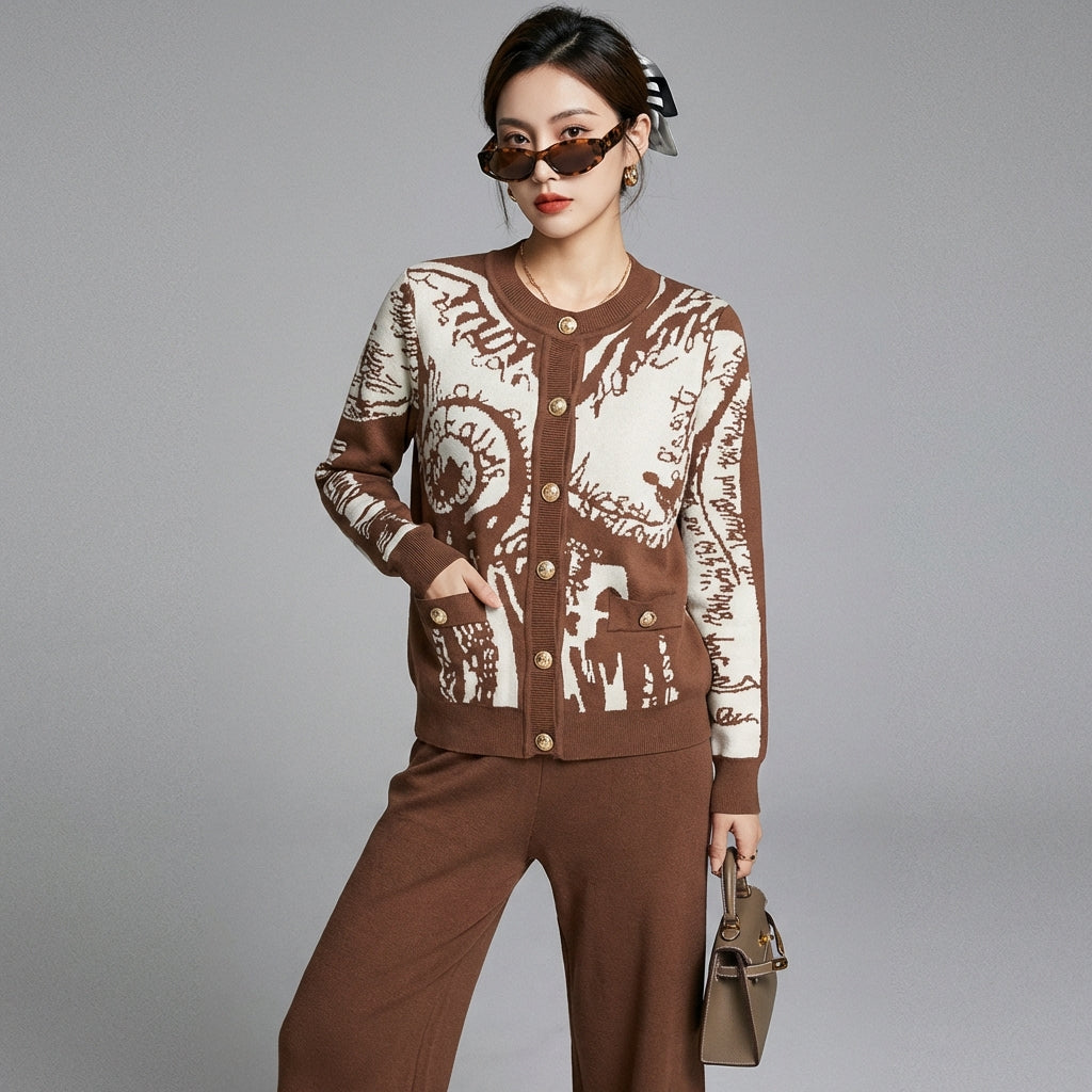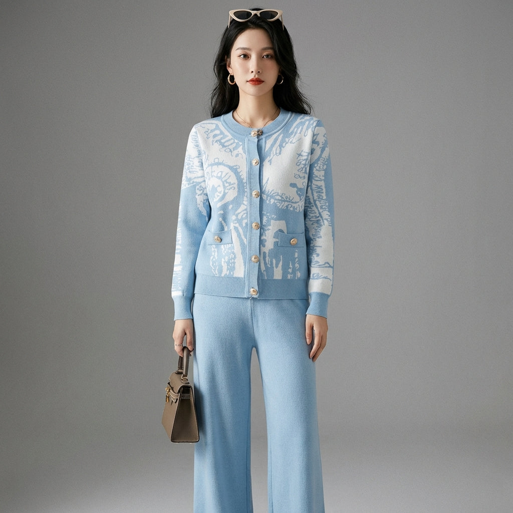 Adopta un look elegante y casual con nuestro conjunto de dos piezas, compuesto por un suéter abotonado de manga larga y un pantalón ancho a juego. Confeccionado en un refinado tejido jacquard, este conjunto ofrece una comodidad óptima y un estilo sofisticado, ¡perfecto para cualquier ocasión! ✨