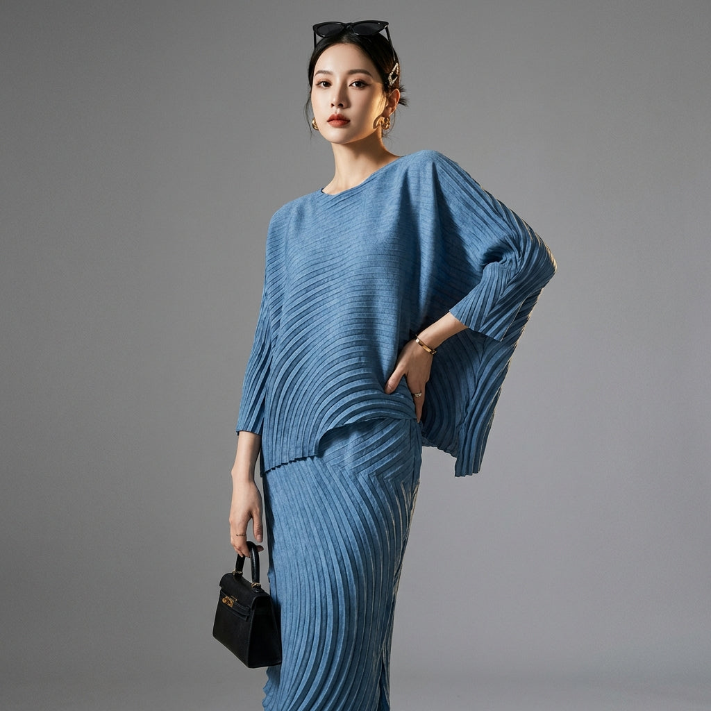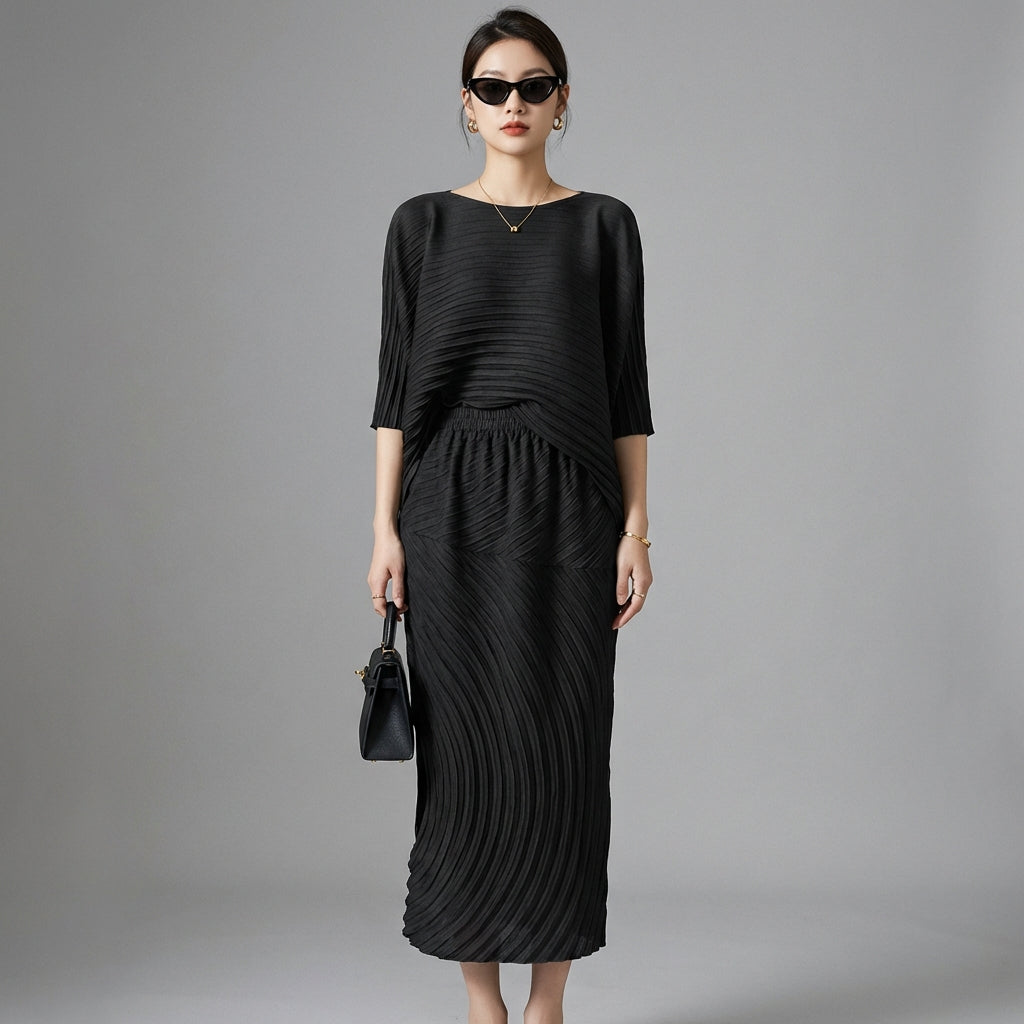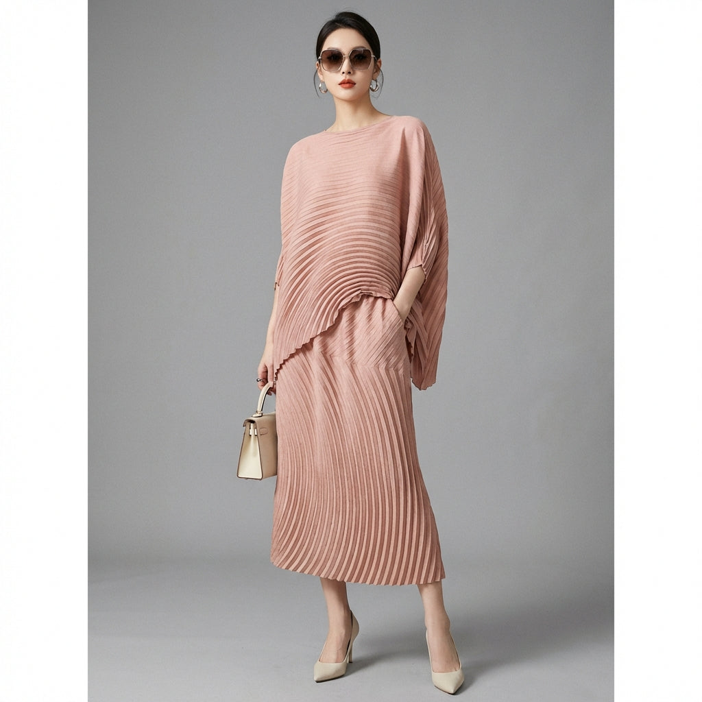 - Tipo: Conjunto de dos piezas, Falda plisada, Top irregular. Un corte contemporáneo que realza la silueta con un toque de originalidad.