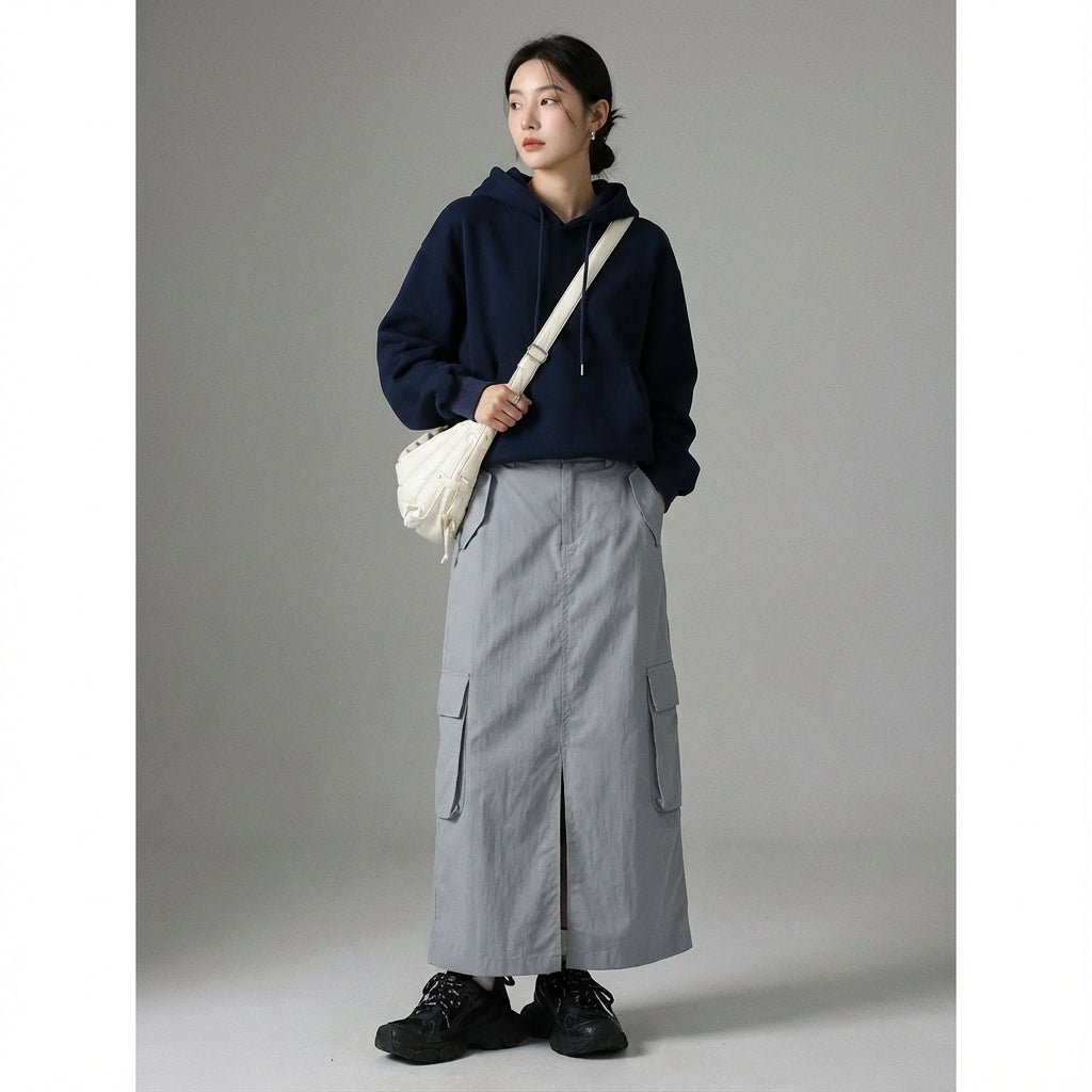 Con su cintura elástica y sus prácticos bolsillos, esta falda larga gris es una elección perfecta para combinar estilo y funcionalidad. Rápidamente se convertirá en una pieza clave de tu vestidor, fácil de combinar para crear conjuntos variados y elegantes.