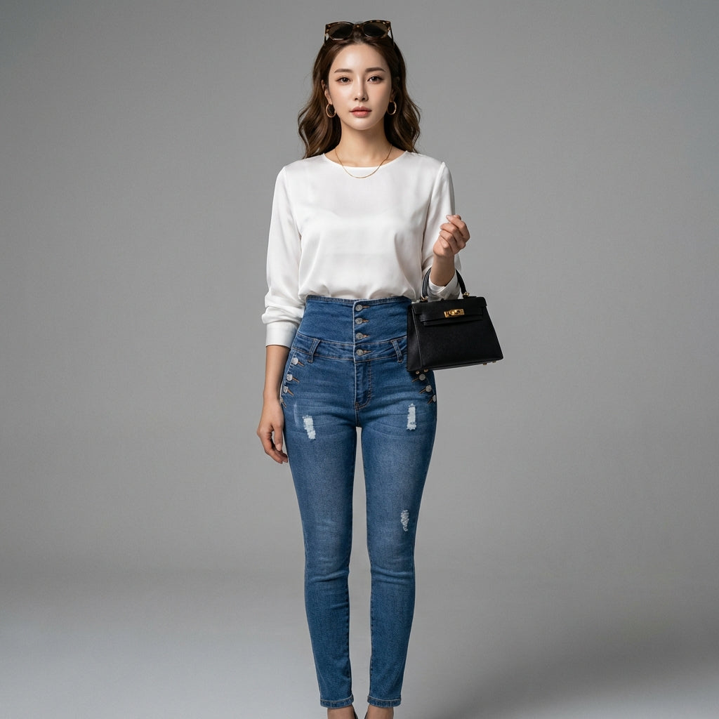 Estos vaqueros skinny de talle alto son un básico imprescindible en el armario, perfectos para quienes buscan estilo, comodidad y un toque de tendencia K-fashion.
