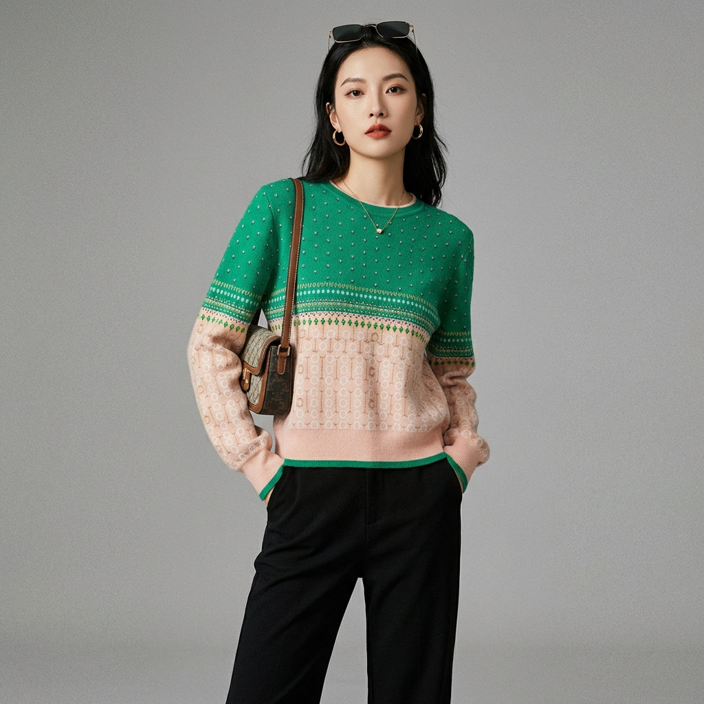 Adopta un look fresco y moderno con nuestro jersey corto de punto jacquard, perfecto para los días más frescos. ¡Su patrón de bloques de color aporta un toque de originalidad y dinamismo a tu atuendo! 🍂