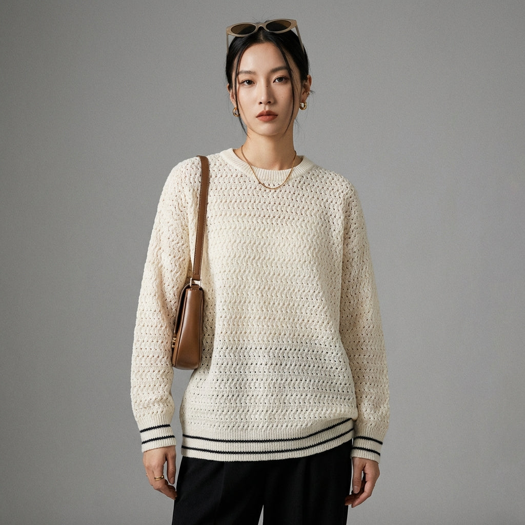 Adopta un look casual y sofisticado con nuestro suéter de punto de cuello redondo. Su diseño calado aporta un toque de originalidad, ¡perfecto para un estilo elegante y cómodo en cualquier temporada! ✨
