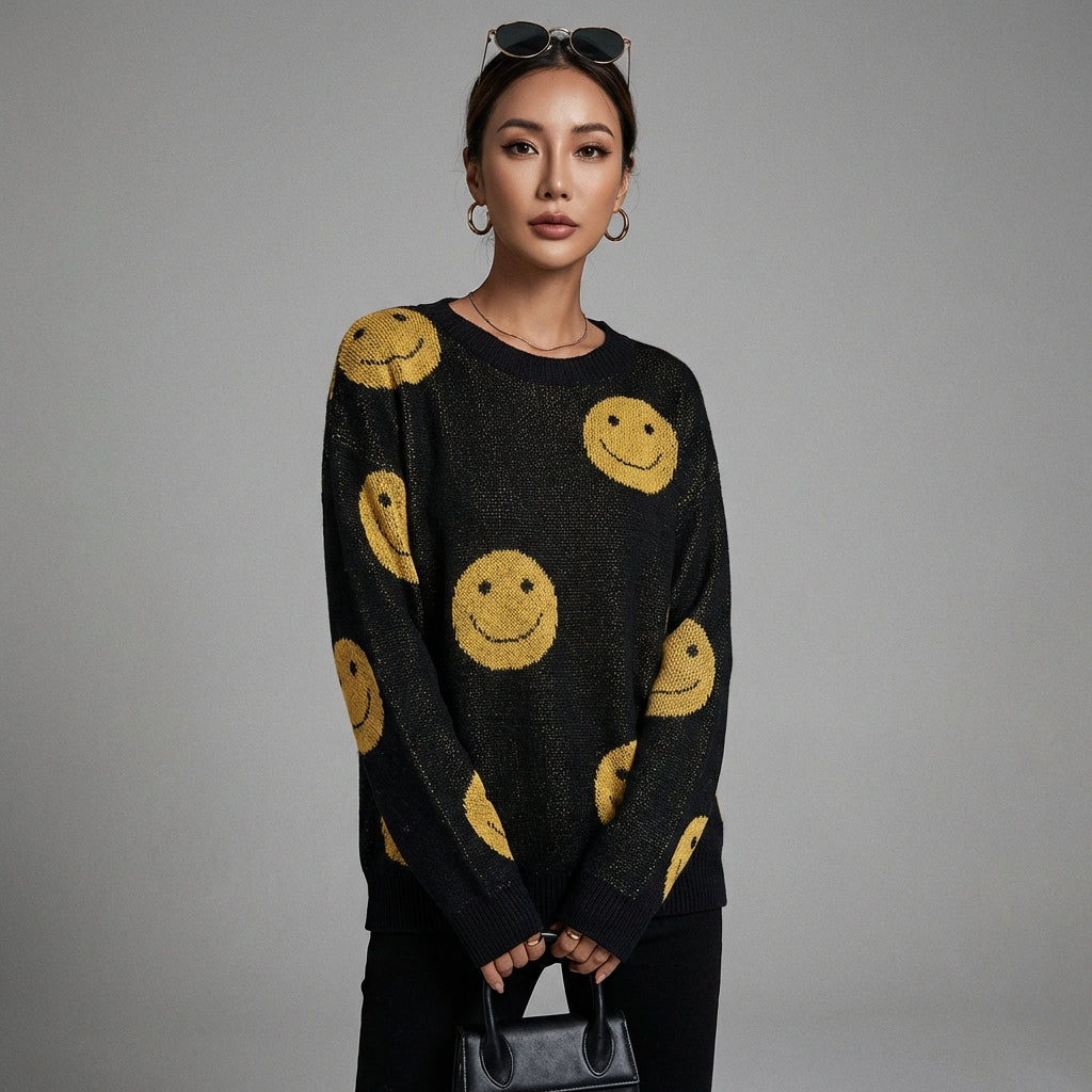 Adopta un look casual y expresivo con nuestro suéter negro de manga larga, adornado con un original motivo de smiley. ¡Su corte holgado y cuello redondo te aseguran una comodidad óptima y un estilo definido! 😊