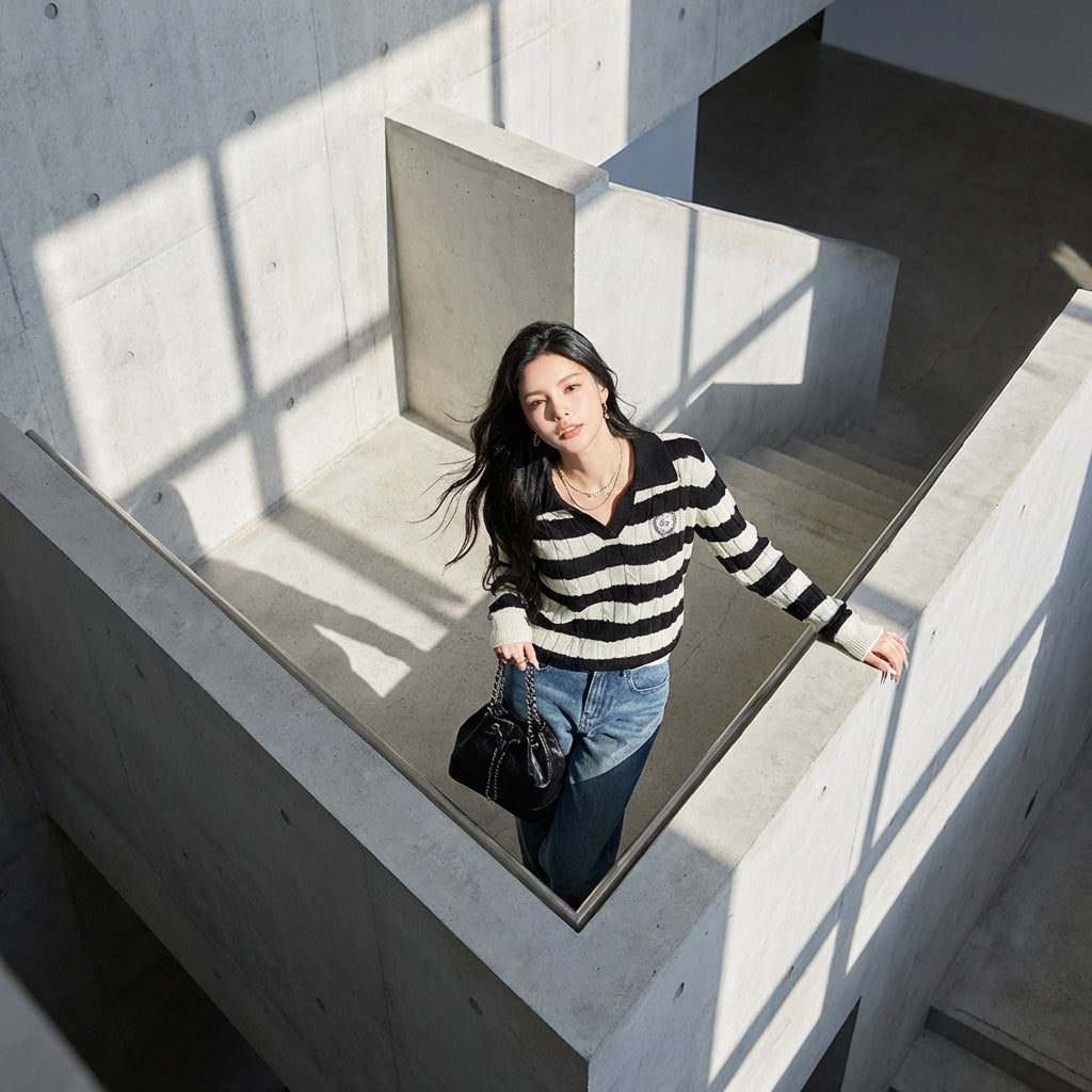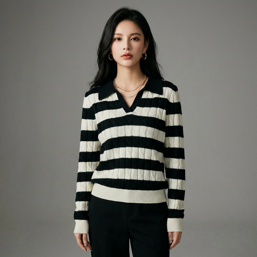 Adopta un look retro chic con nuestro suéter polo a rayas con cuello vuelto. Perfecto para un estilo casual y a la moda, te acompañará con elegancia durante el otoño y el invierno. ¡Un imprescindible para los amantes de la moda vintage! 🍂