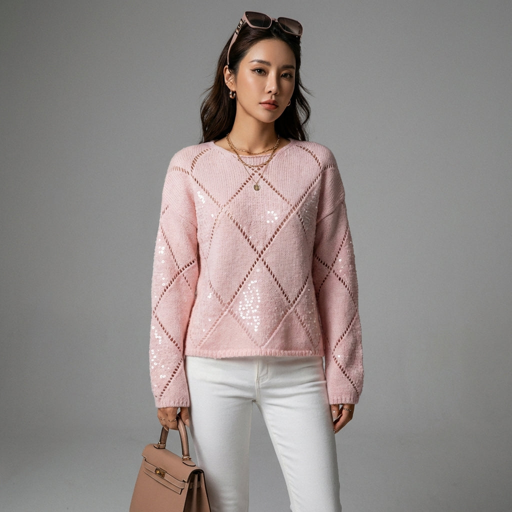 Adopta un look glamuroso y casual con nuestro suéter de punto de corte holgado, realzado con delicadas lentejuelas. Su patrón de rombos calados añade un toque de originalidad y feminidad, ¡perfecto para brillar en cualquier ocasión! ✨
