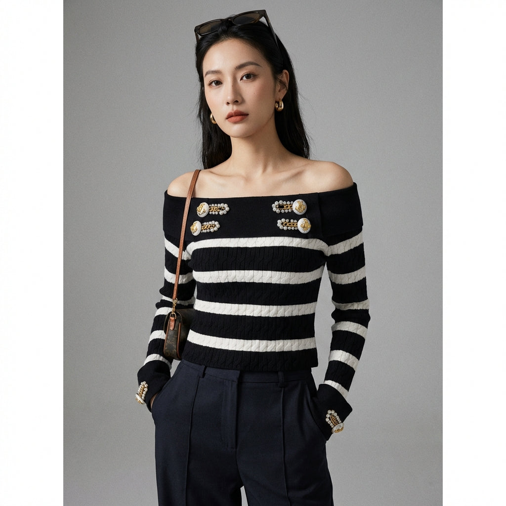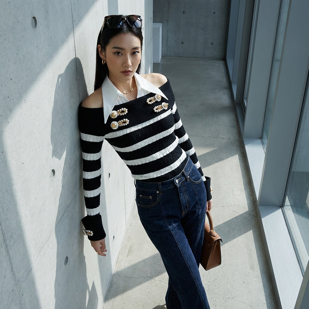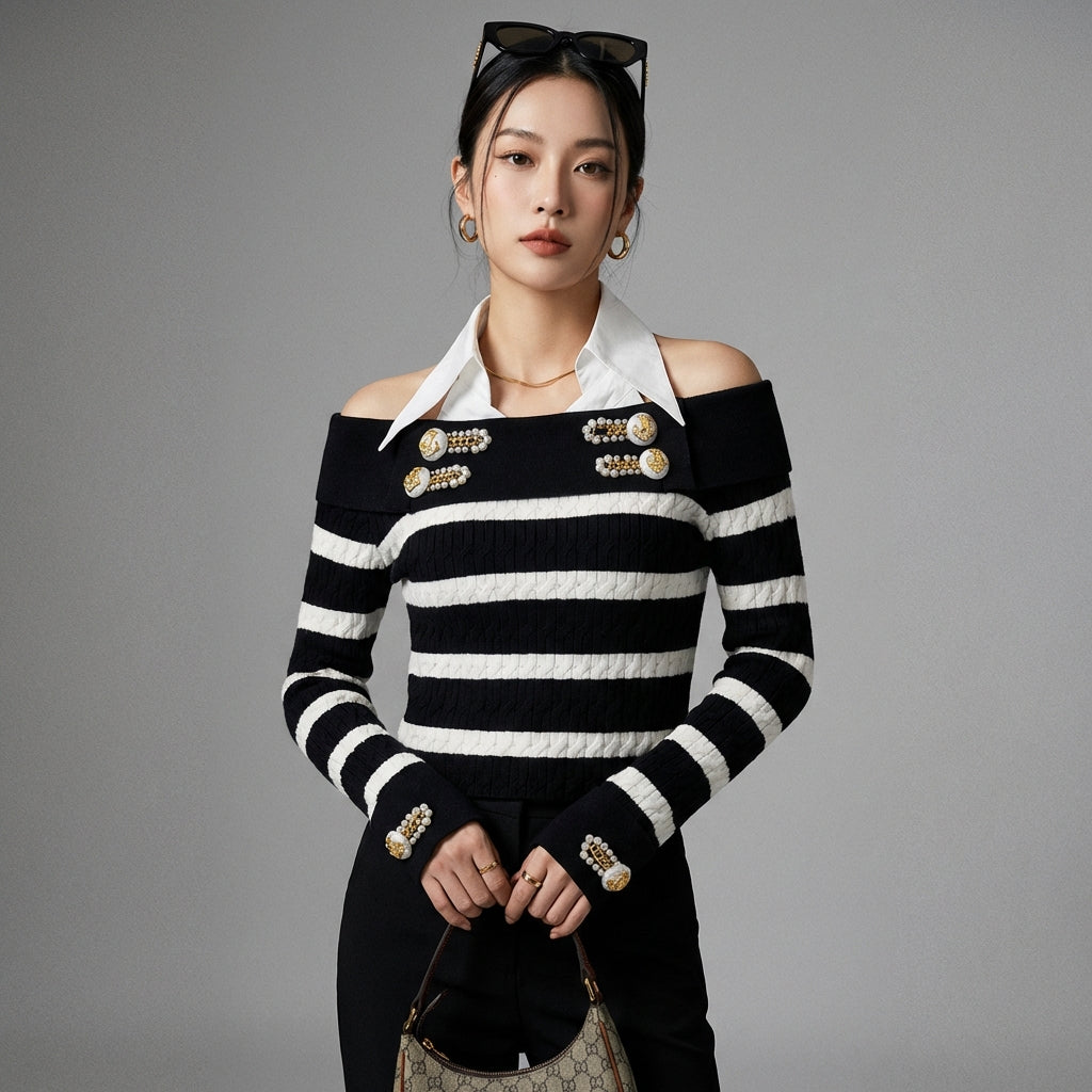 Adopta un look atrevido y a la moda con nuestro jersey de rayas con hombros descubiertos. Su diseño moderno y corte ajustado lo convierten en una prenda imprescindible para un estilo casual y chic. ¡Perfecto para añadir un toque de originalidad a tu armario! ✨