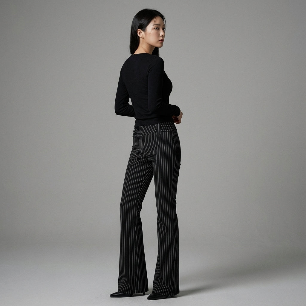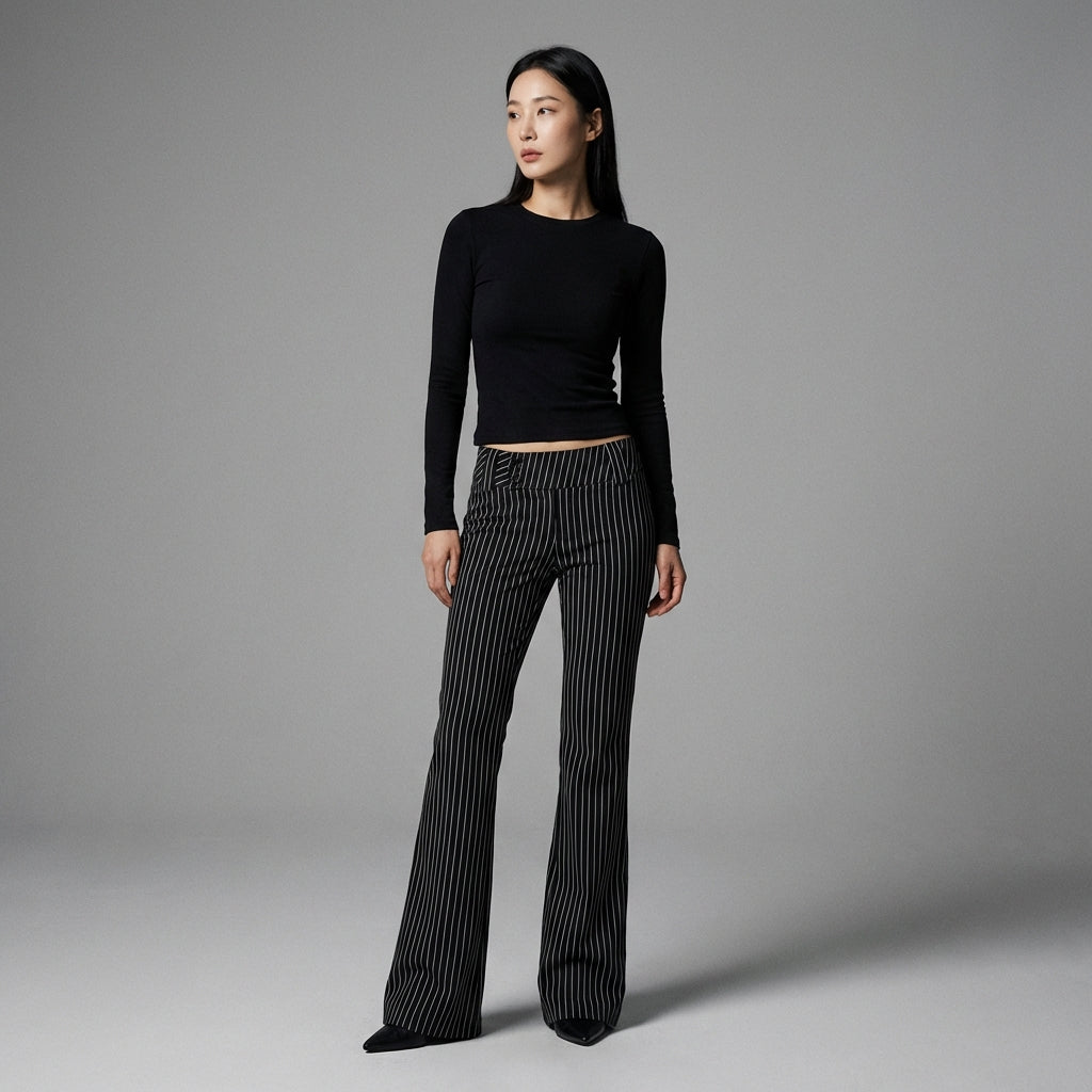 - Tipo: Pantalones acampanados, Tiro bajo. Su corte acampanado y su tiro bajo alargan la silueta y añaden un toque retro-chic.