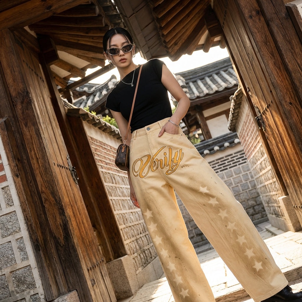 - Estilo: Streetwear, Retro Americano, Moda coreana. Estos pantalones encarnan el espíritu casual y audaz de la moda urbana, con un toque retro y K-fashion.