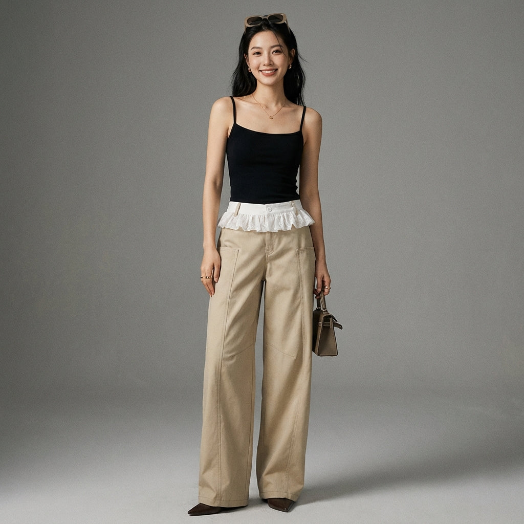 Adopta un look moderno y sofisticado con nuestros pantalones anchos de talle alto, realzados con detalles de encaje. ¡Ideal para un estilo casual chic o un estilo streetwear atrevido! ✨