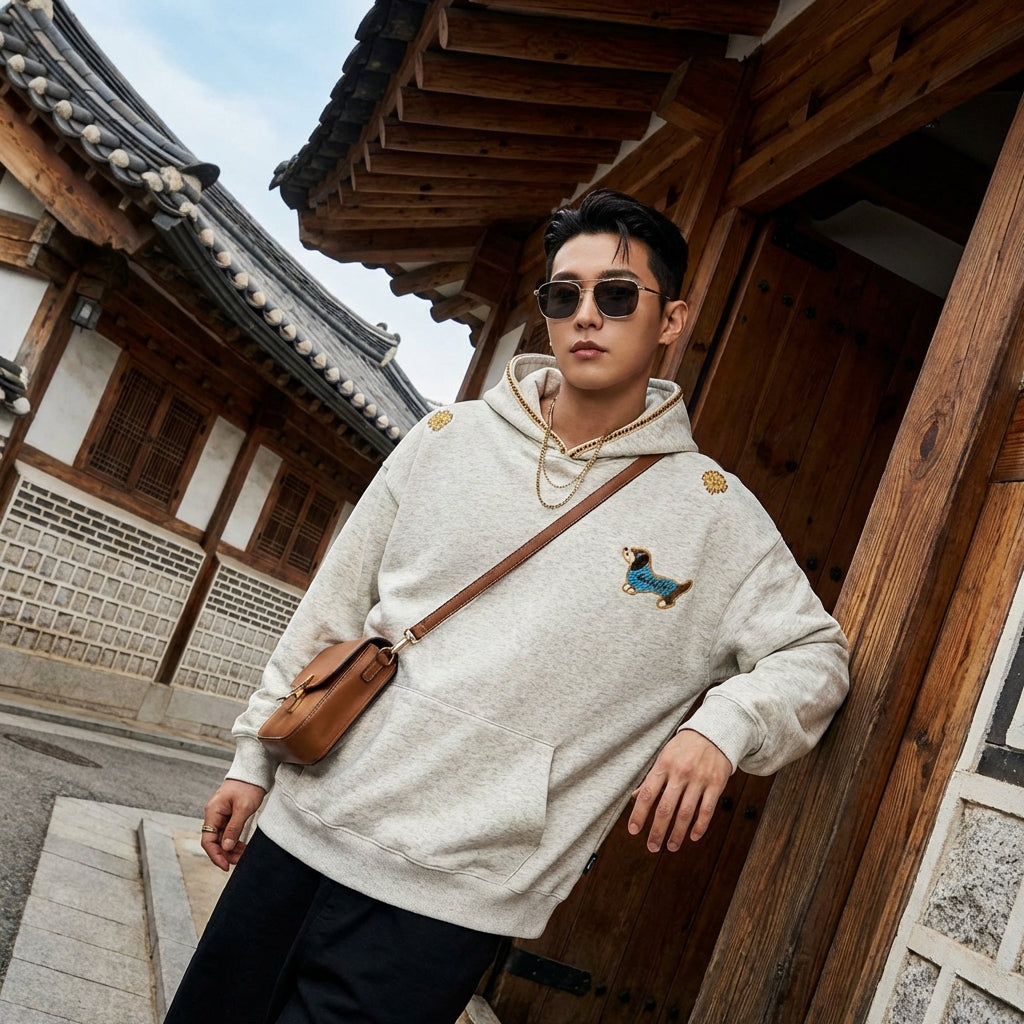 - Estilo: Streetwear, Retro, K-fashion. Esta sudadera con capucha encarna el espíritu casual y moderno de la moda urbana, con un toque vintage inspirado en las tendencias coreanas.