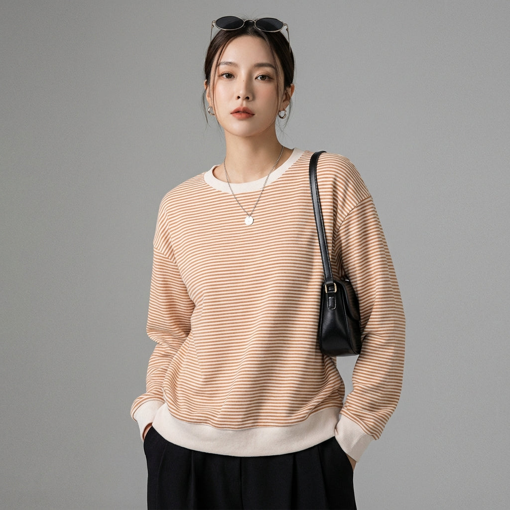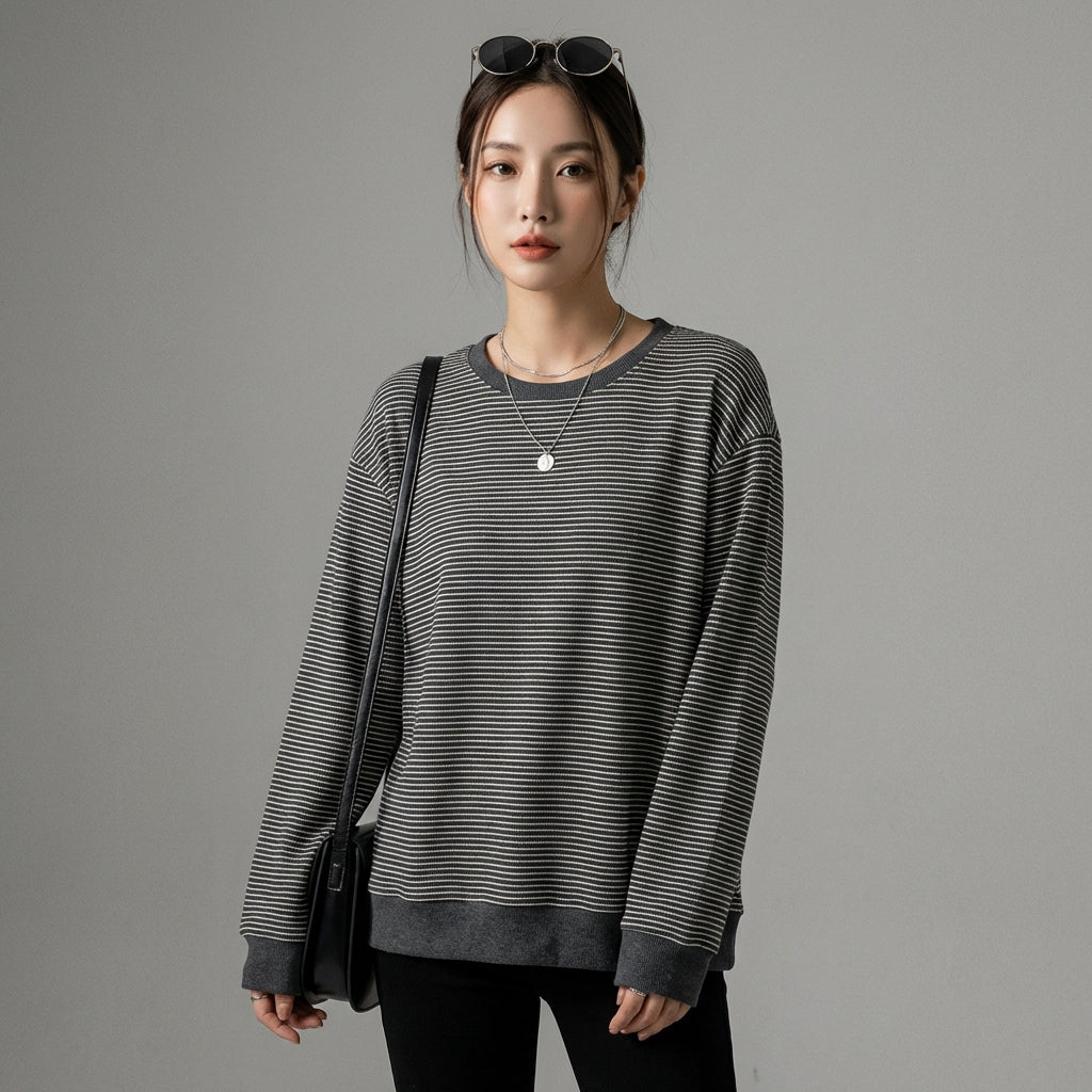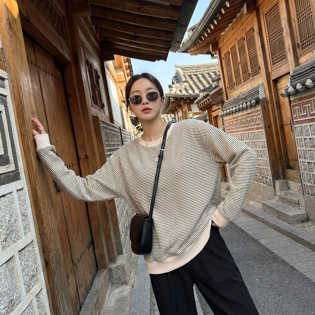 Esta sudadera a rayas es la prenda ideal para quienes buscan un atuendo versátil, que combine comodidad absoluta y una estética moderna inspirada en la moda coreana.