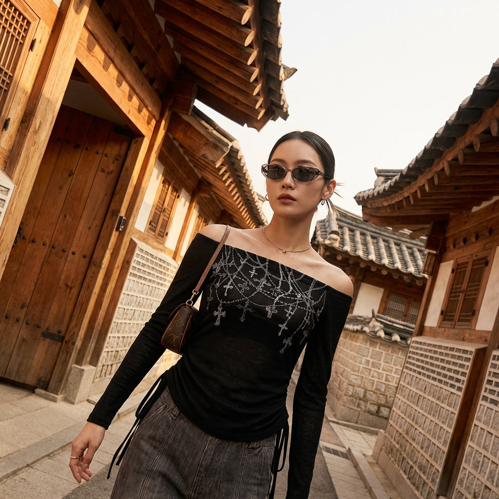 - Estilo: K-fashion, Streetwear, Atrevido. Este top encarna el espíritu de la moda coreana, con un toque de originalidad y modernidad.