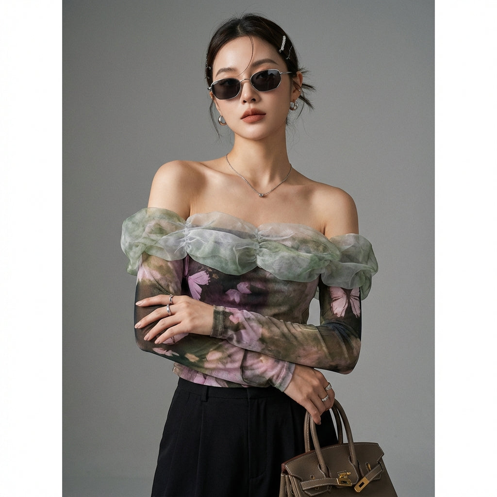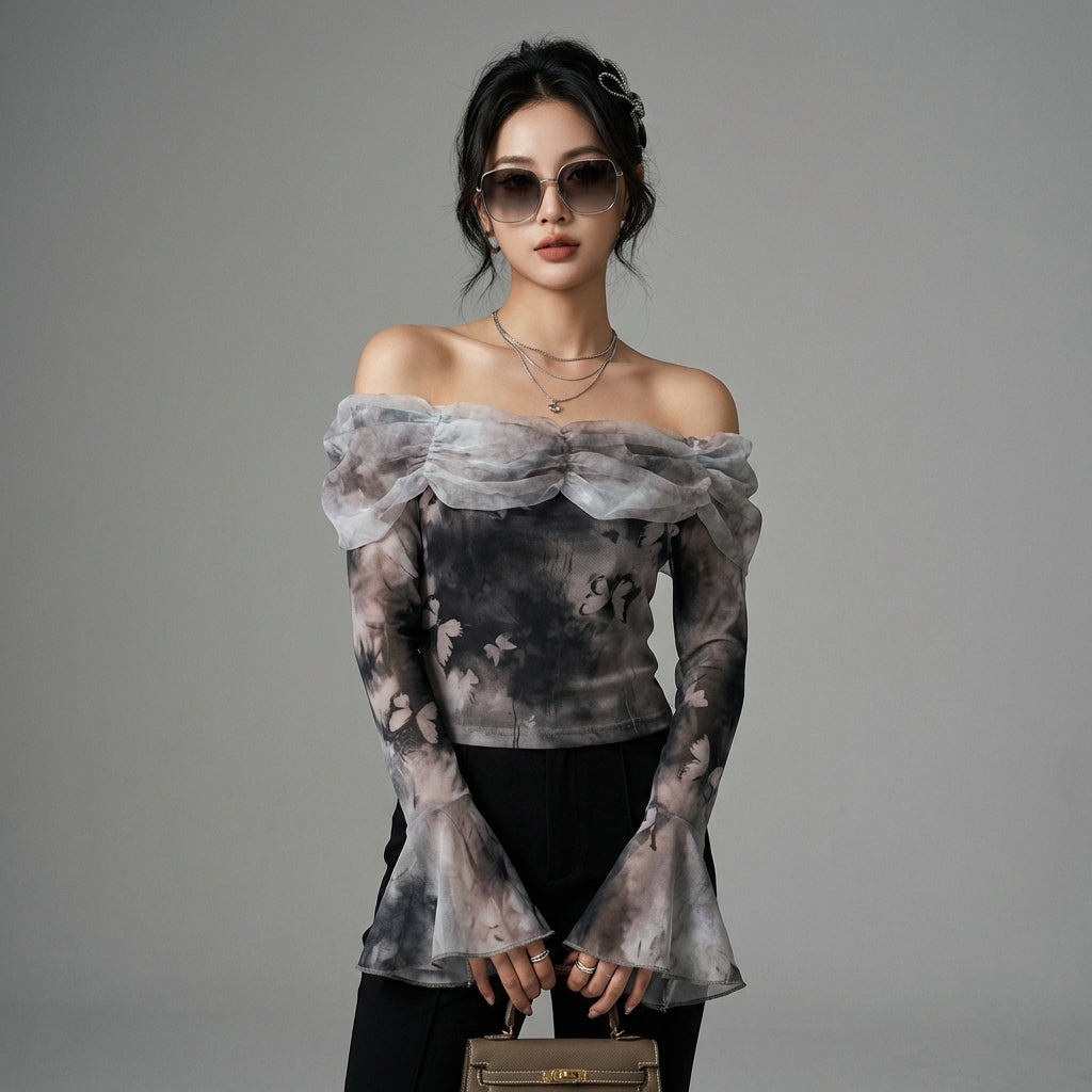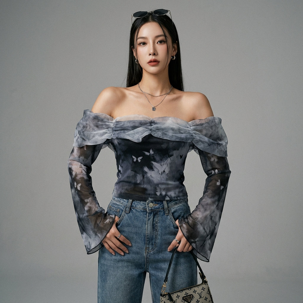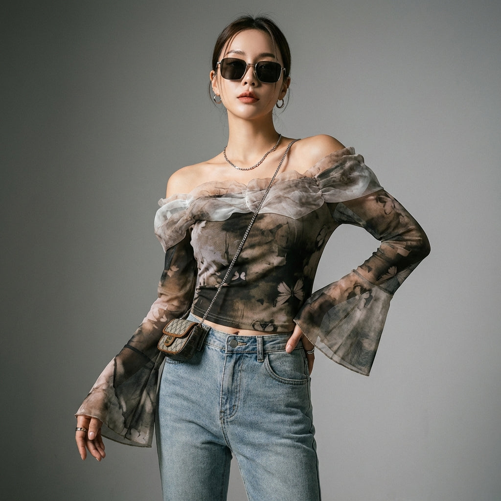 Afirma tu estilo con nuestro top asimétrico de malla, con grandes mangas acampanadas para una silueta atrevida y moderna. ¡Este top corto de un solo hombro es perfecto para quienes se atreven con la originalidad y quieren destacar con elegancia! 💫