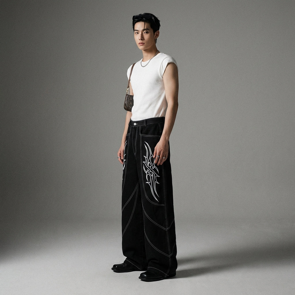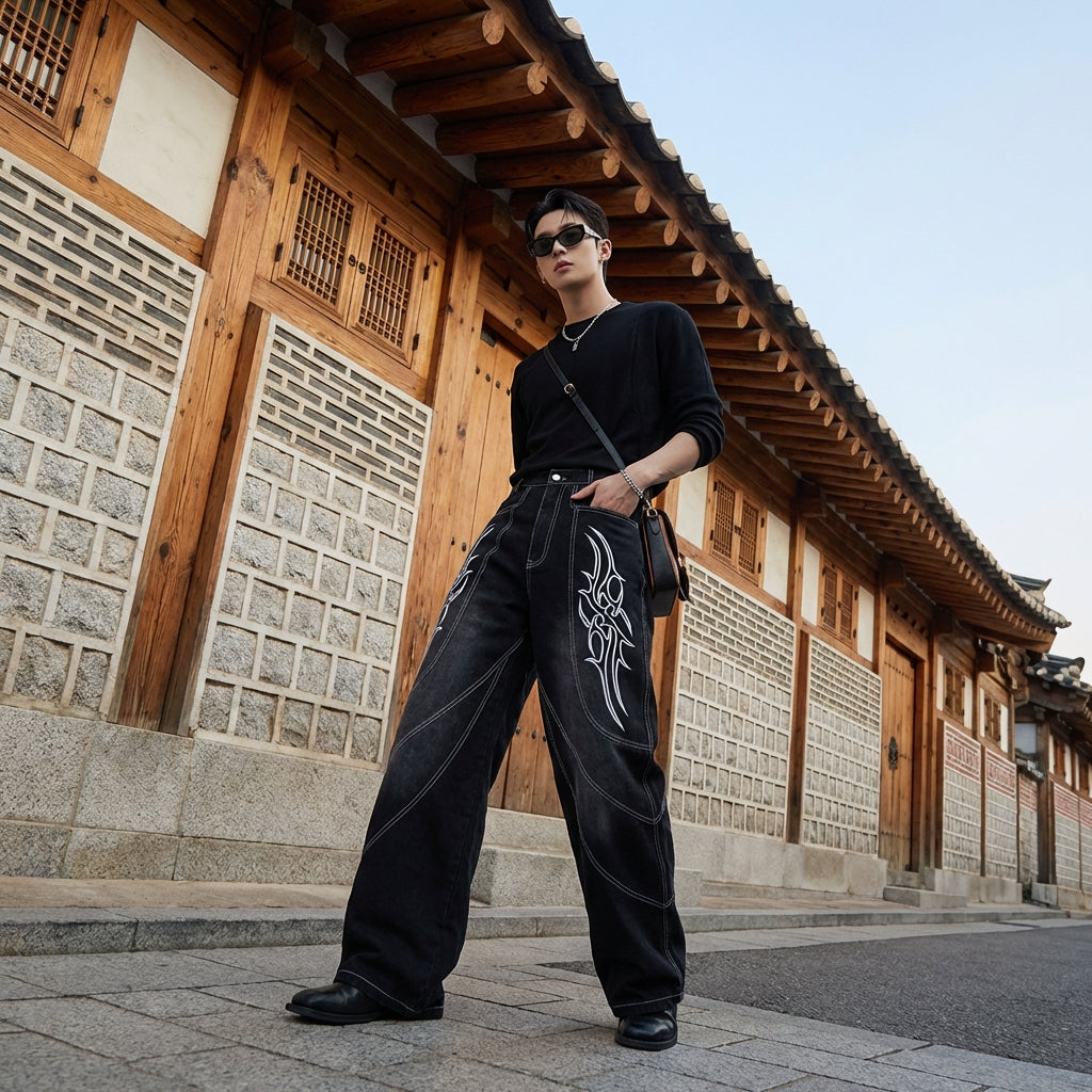 - Estilo: Streetwear, Tendencia, K-fashion. Estos vaqueros encarnan el espíritu de la moda urbana coreana con un toque de originalidad gracias a sus bordados.