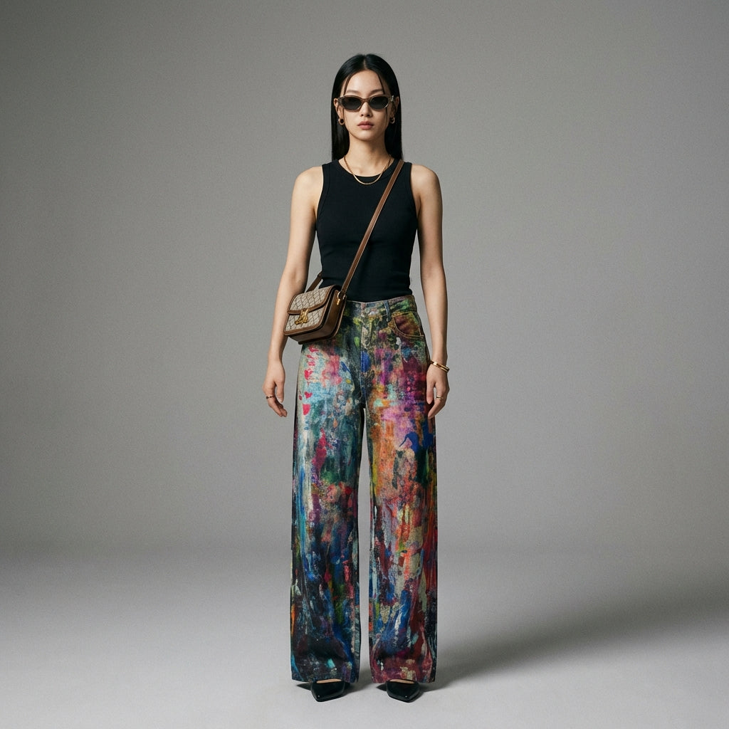 - Estilo: Streetwear, Arte, Tendencia K-fashion. Estos jeans encarnan la audacia de la moda urbana coreana con un toque artístico moderno.