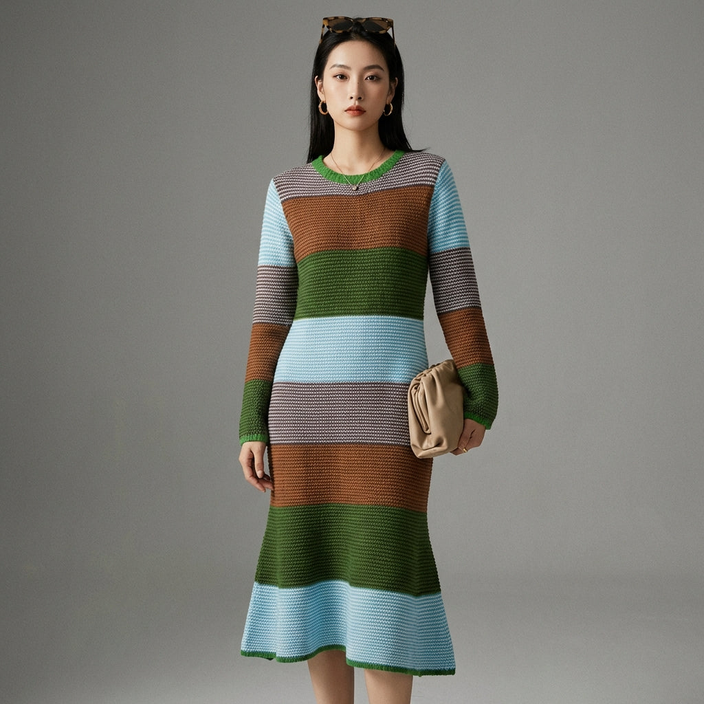 Adopta un look moderno y refinado con nuestro vestido de punto bicolor, perfecto para cualquier ocasión. Su cuello redondo y sus mangas largas ofrecen una comodidad óptima, mientras que su cintura alta acentúa una silueta elegante y relajada. ✨